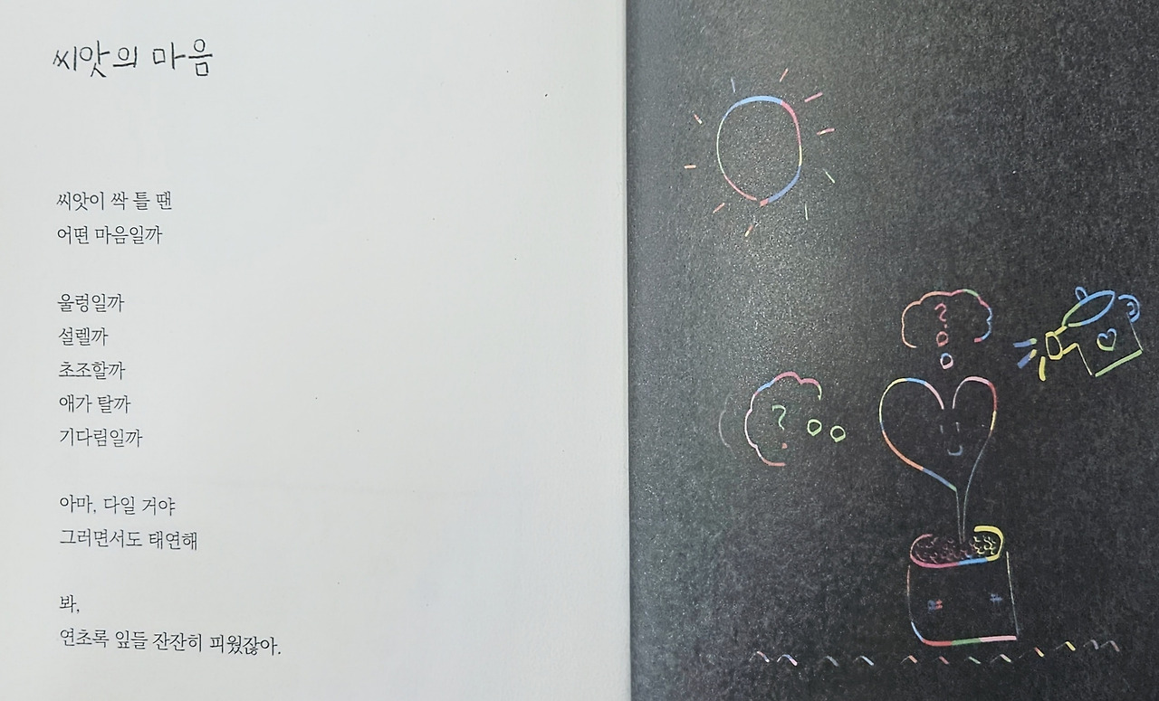 가족이나 개인사적인 이야기를 벗어나 더욱 큰 세계관과 넓은 스펙트럼으로 아이들의 마음도 넓고 크게 확장시켜 주는 두툼한 의미를 주는 동시집이었다. 이 책이 더 의미가 있는 것은 아이들이 직접 동시집의 삽화를 그렸다는 것이다. 동시를 함께 완성한 그들에게도 축하와 찬사를 보낸다. 다음 동시를 보자.