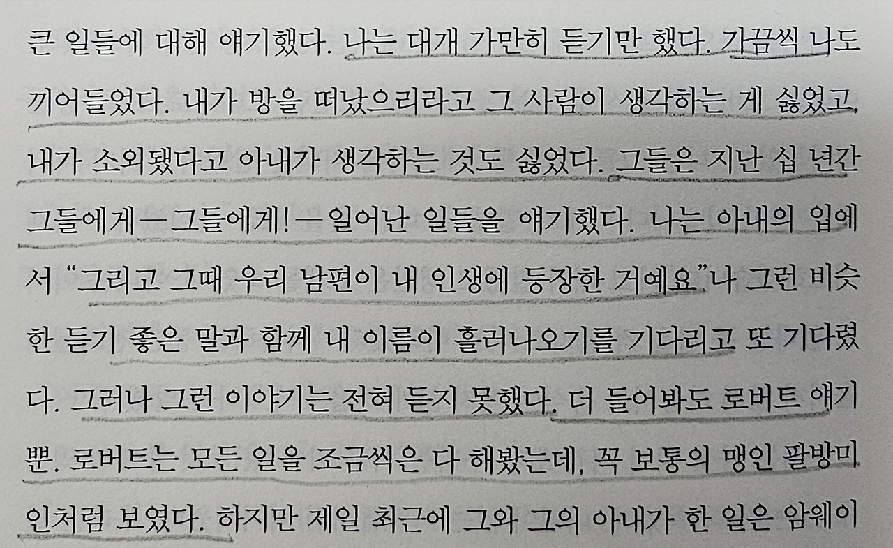 내가 아는 것보다 모르는 것이 훨씬 더 많은 것처럼, 눈에 보이는 세계보다 보이지 않은 세계가 훨씬 더 넓고 크다는 것을 알게 해 주었다. 눈이 보이지 않는다는 장애를 가졌으면서도 넓고 유연한 생각을 가진 로버트가 특별한 사람처럼 느껴졌다.