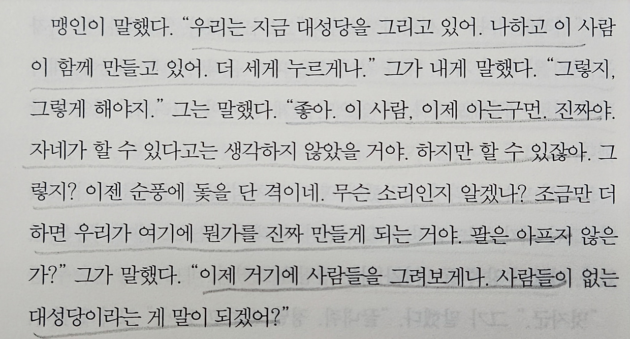 나도 내가 농부가 되어 생소한 블루베리 나무를 키우고, 알레르기까지 있었던 복숭아나무를 직접 기르는 사람이 될 줄은 정말 몰랐다. ‘삶이 희한한’ 것이라는 것을 충분히 느낄 수 있는 부분이었다. 주인공은 로버트와 함께 손에 펜을 쥐고 대성당을 그려 나가면서 생각한다.
