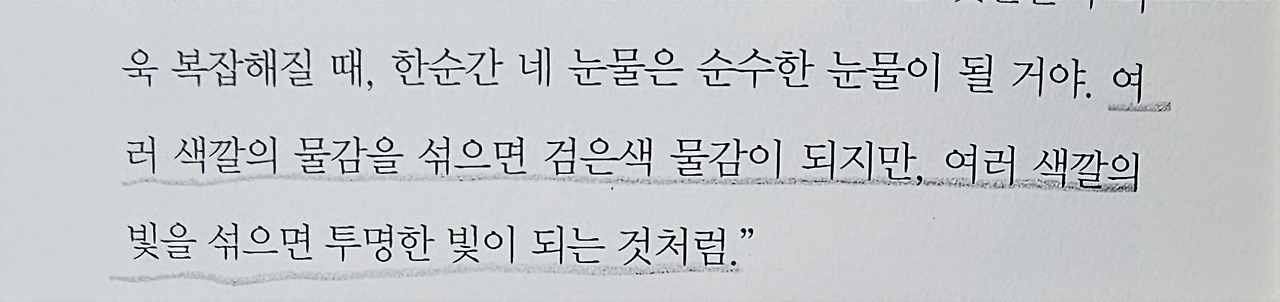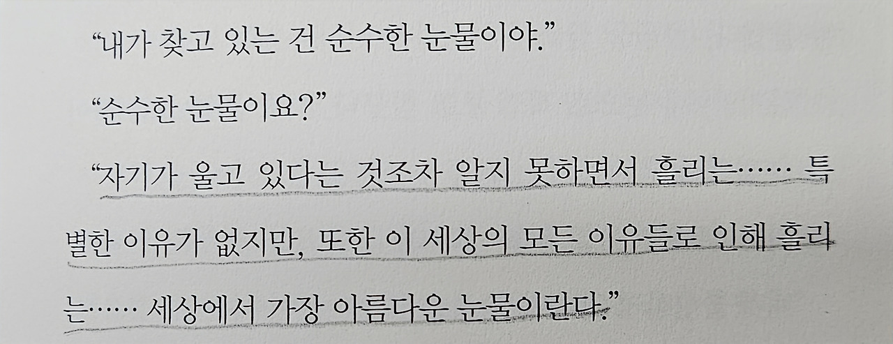 “순수한 눈물이란 아무것도 담겨 있지 않은 눈물을 말하는 게 아니야, 모든 뜨거움과 서늘함, 가장 눈부신 밝음과 가장 어두운 그늘까지 담길 때, 거기 진짜 빛이 어리는 거야.”(p63~64)