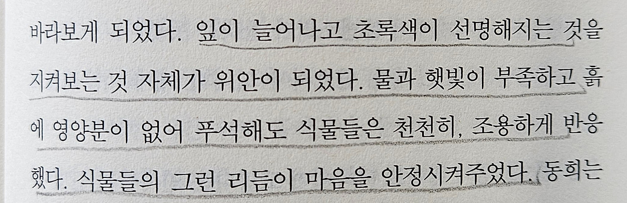 (본부장실을 비우게 된 사건을 다른 직원들은 동희가 밀려나는 거라고 수군거린다. 그것을 참아내야 하는 동희의 낮이 참 많이 불편했을 것 같다. 정성으로 키운 화분들을 집으로 옮기면, 회사에서 영영 나와야 할 것처럼 불안했다. 여러 가지 마음을 다잡고 회사를 그만두지 않기로 작정했다는 것을 새 사무실에 화분을 놓기로 한 것에서 읽어낼 수 있었다. 주인공이 쉴 수 있는 유일한 시간인 편안한 밤이 끝나지 않았으면 좋겠고, 삶의 밤은 끝났으면 좋겠다.)