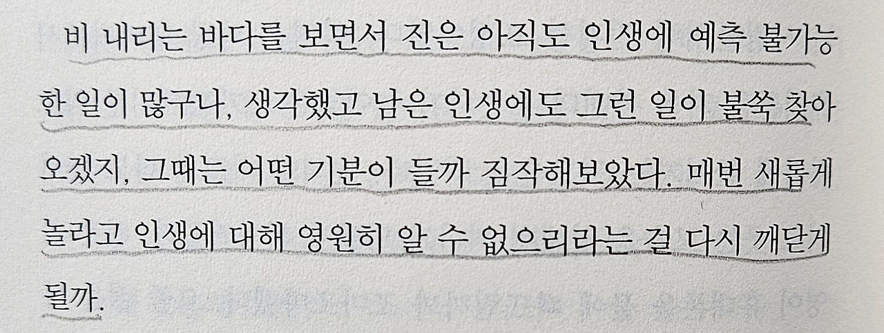 (비 오는 바다에서 노는 사람들을 불안한 마음으로 읽어 나가던 나였다. 어떤 무서운 일이 일어날 것만 같은 위태로운 전개가 끝까지 책을 읽어나가는 힘이었다. 무언가, 평범한 일상을 깨기 두려워하고 살얼음판을 걷듯 살아가는 나에게 남편은 보수적이라고 말하기도 하지만, 나는 전혀 그렇게 생각지 않는다. 파도에 몸을 맡기는 자유를 느끼고 싶지만, 물 공포증이 있는 내게는 어려운 일이다. 진의 무한한 자유가 내게도 전해져 왔다.)