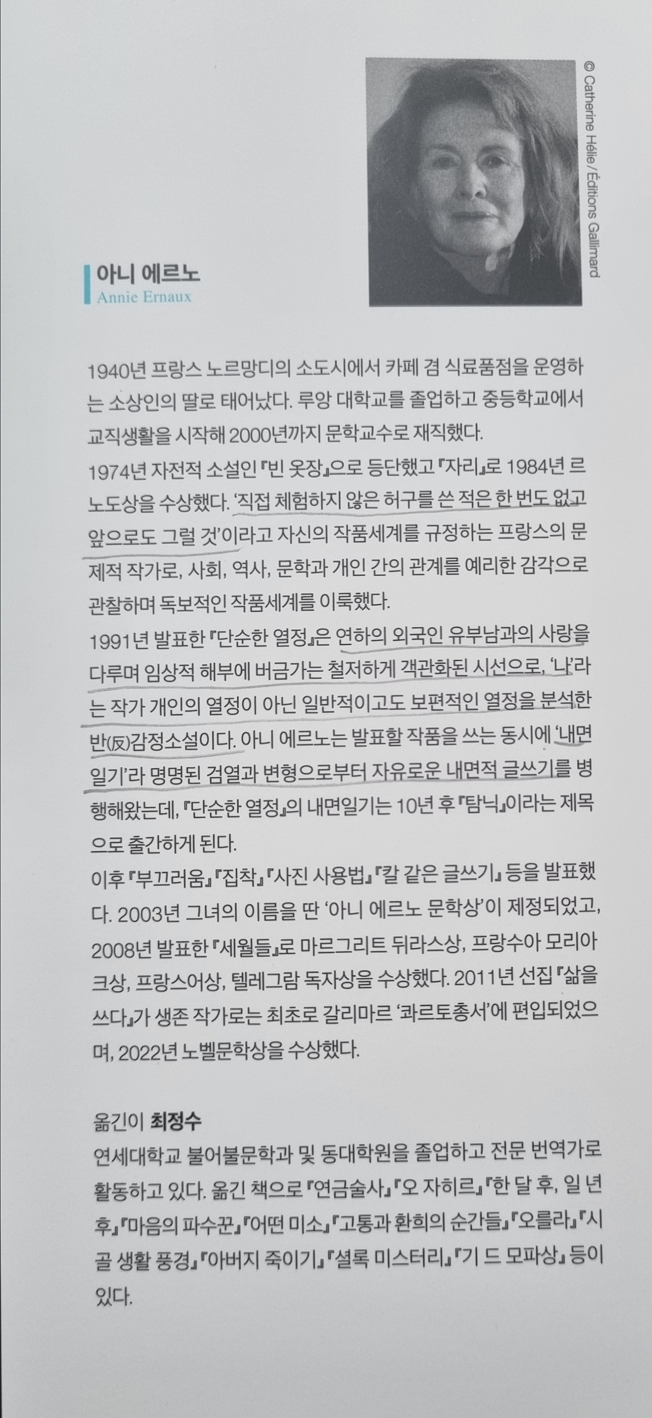 『단순한 열정』은 비교적 짧은 소설이다. 책의 구성은 뒤편에 숭실대 불문과 교수인 이재룡 문학평론가「소외된 사람들을 위한 글쓰기」라는 해설에서 아니 에르노와 그의 작품세계를 18쪽에 걸쳐서 자세하고 다루고 있다는 특징이 있다. 노벨상을 받아 주목받고 있는 아니 에르노에 대해 알고, 작품세계를 살펴볼 수 있어서 좋았다.