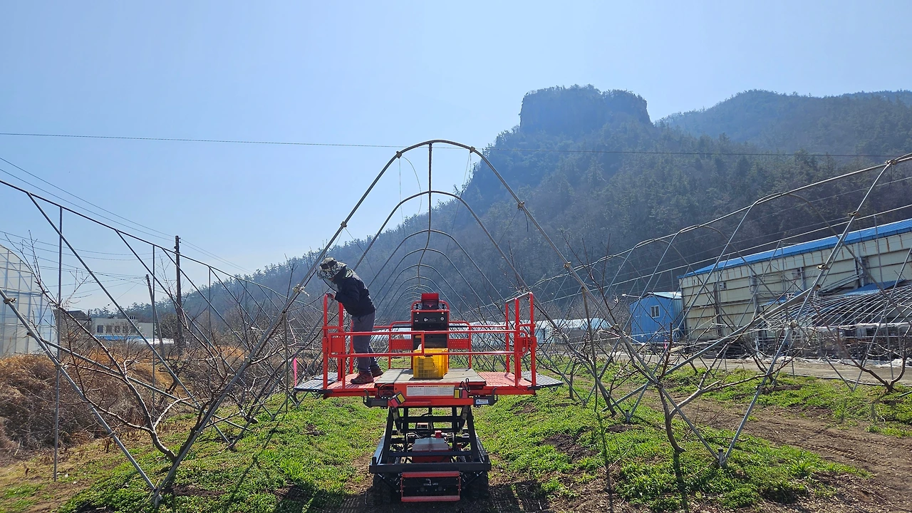 오늘은 고소작업 차를 대동하고 복숭아밭으로 왔다. 3단과 4단의 가지치기와 유인 작업을 했다. 미진했던 2단의 나뭇가지 상황도 점검하고, 3단과 4단에 필요한 작업도 했다. 앞으로 일주일 정도 더 작업해야 마칠 수 있을 것 같다.