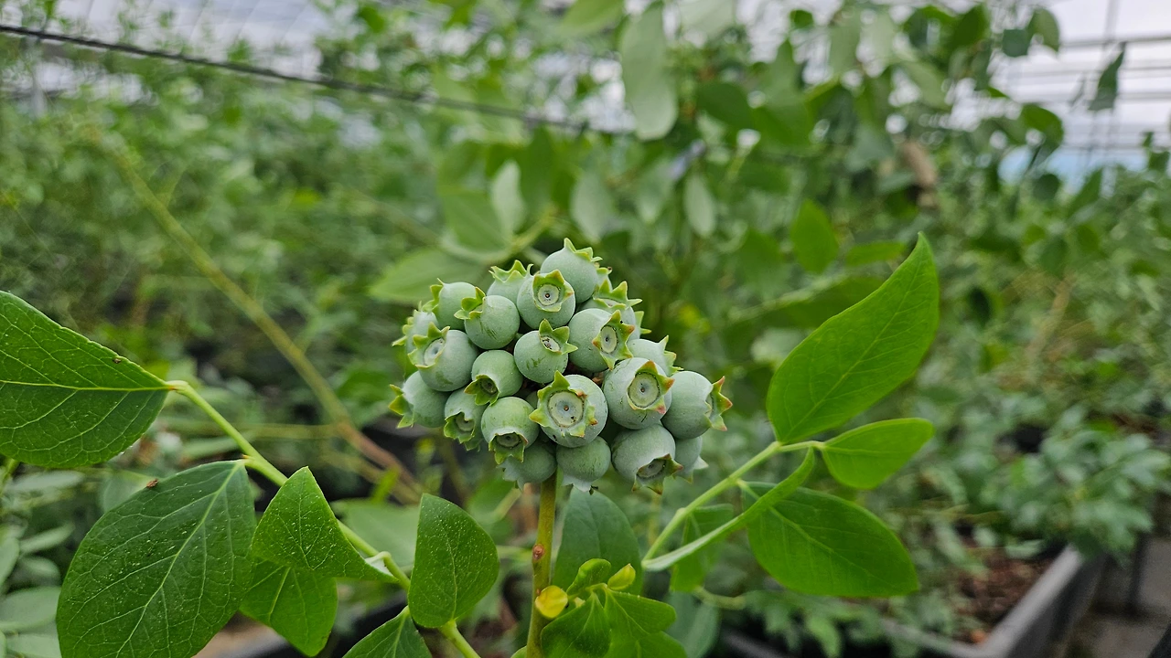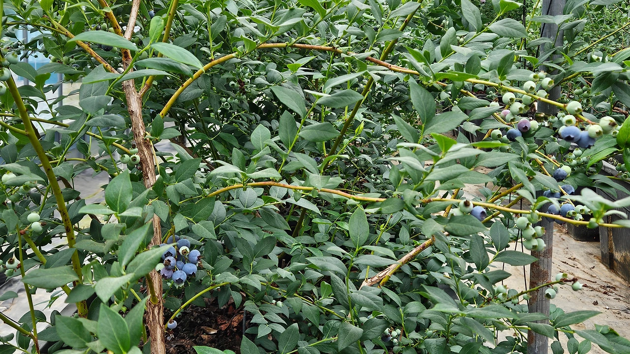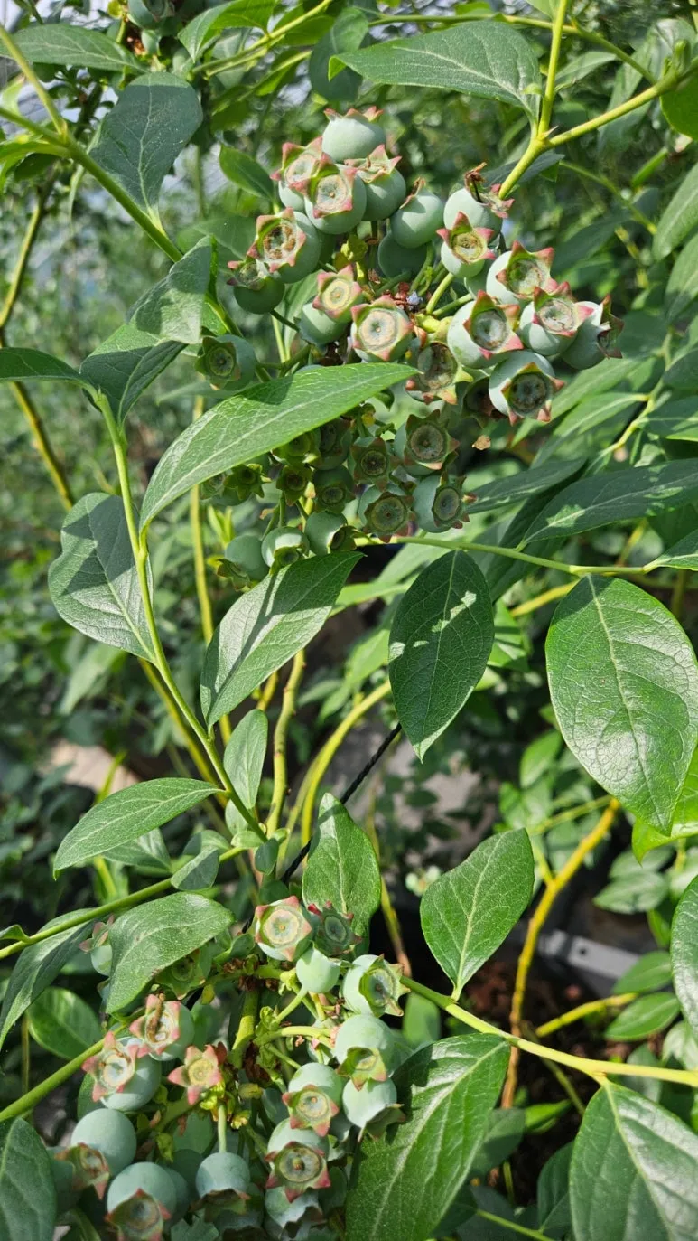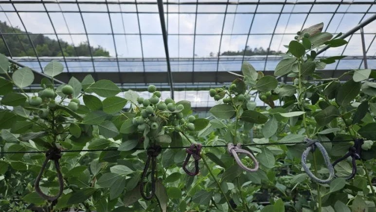 어제보다 오늘 더 많은 열매들의 색깔이 바뀌고 있었다. 사흘 만에 떠오른 해님이 반가워 블루베리 하우스도 창을 활짝 열었다. 계획했던 것과 다르게, 아래로 내려온 가지들을 유인선에 묶어주는 작업을 오늘까지 해 주었고, 키가 큰 품종이 3단까지 유인선을 만들어 3단에 고정해 주었다.