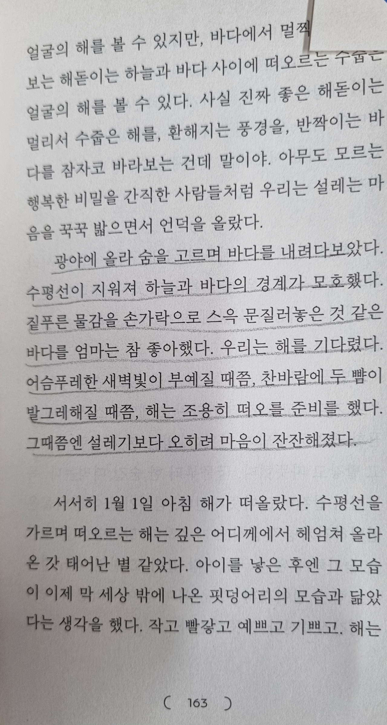 책에서 바다가 보이면 내 기억 속에서는 마을 앞에 있는 자그마한 저수지가 떠올랐고, 시인지 에세이인지 모를 아름다운 묘사들에 흠뻑 취하고 그 서정적 감정에 빠져들어 턱을 괴고 오랫동안 책과 동일체가 되어 젖어들었다. 책을 덮고 나서는 하나의 아니, 여러 개의 또 다른 삶을 살아 낸 느낌이었다.