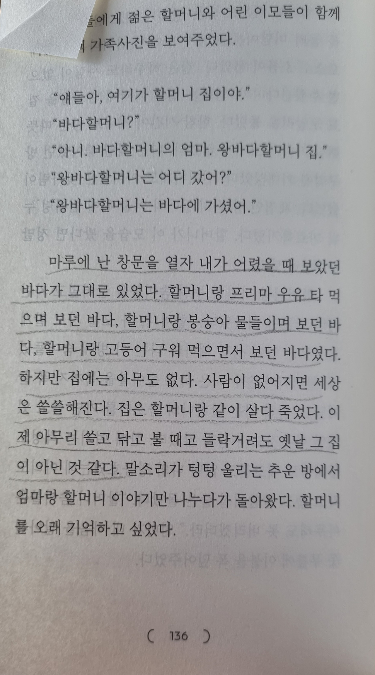 어린 시절 할머니와 한방에서 생활했던 나는 늘 웃음을 잃지 않으셨던 인자한 할머니를 기억하고 있다. 작가의 할머니에 대한 이야기를 읽으며 다정하셨던 나의 할머니를 떠올렸다. 숨을 헐떡이면서도 밤마다 손녀들의 이야기해달라는 매달림에 옛날이야기를 끊임없이 들려주셨던 다정하신 나의 할머니처럼 작가의 할머니도 손으로 등을 다독여주고 손톱에 봉숭아 물들여주시고, 맛있는 음식들로 삶을 달래 주셨다고 한다.