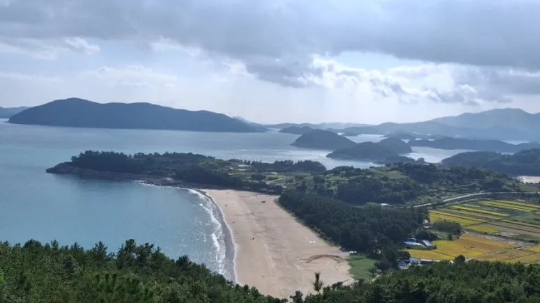 전망대에서 내려다 보이는 남열 해수욕장과 그림처럼 펼쳐진 섬들이 아름다웠다. 벌써, 나락을 벨 때가 되었는지 벼들이 고개를 숙이고 있었고, 이미 추수를 마친 곳도 보였다. 고흥은 따뜻한 남쪽이라 추수도 내륙보다 빠르다는 것을 알았다. 30여 년 전에 걸어서 오르며 무척 힘들었던 길이었는데 차로 순식간에 올랐다.