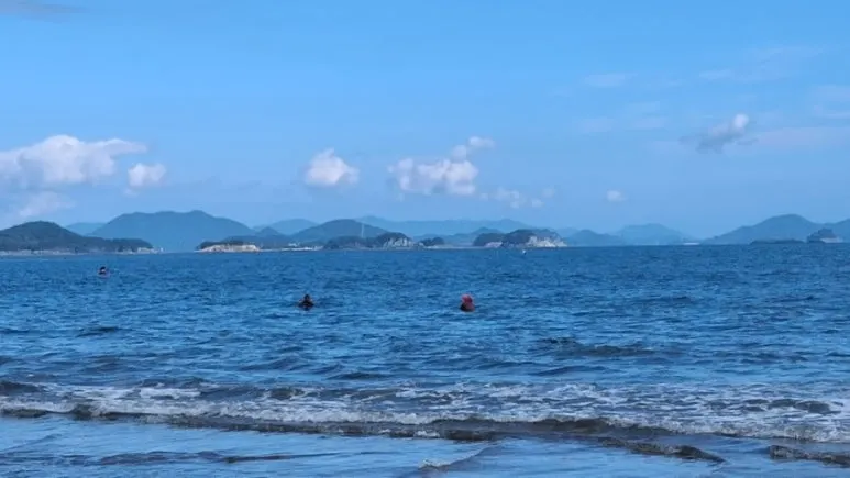 두 사람은 저곳에서 무얼 하는지 모르겠다. 목만 내놓고 있다. 양쪽에서 그물을 붙잡고 서 있는 것처럼 보였다. 다른 사람들처럼 고개를 물속에 넣지도 않고, 손을 위로 올리지도 않고, 장소를 옮기지도 않았다. 나는 모래사장을 걸어 들어가 한참을 조개도 줍고, 바닷물도 만져 보았다. 둘째는 넓은 바다가 무서운지 해송 숲에서 더 이상 가까이 오지 않았다.