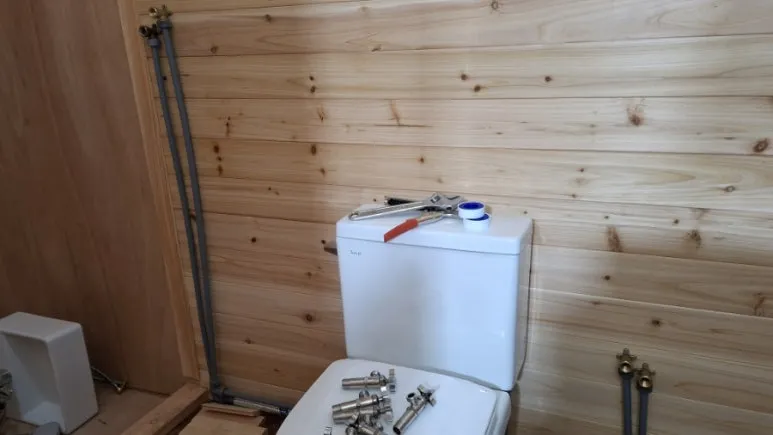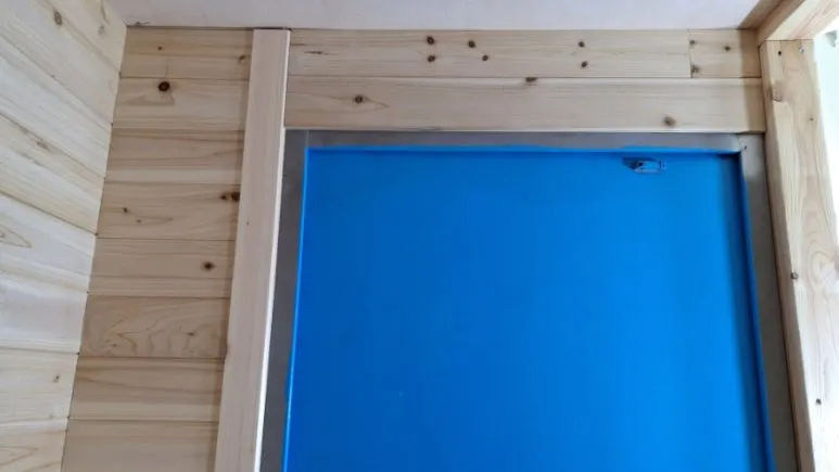 화장실 벽체 마감 작업을 완성했다. 구석 쪽을 마무리했고, 출입구 위도 마무리했다. 폭이 좁고, 구석진 부분이라 세로로 붙여 양쪽에서 잡아주던 목재를 한쪽에만 붙여서 끼우는 방식으로 마무리했다.