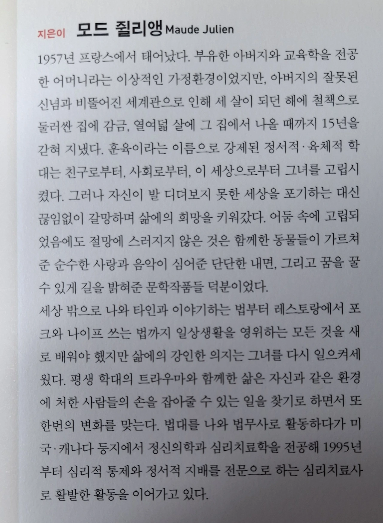 세 살부터 단계적으로 행해지는 훈련들과 그것과 마주한 모드의 생각, 자세, 마음 등이 은유적인 표현으로 흡입력을 높여 준다. 조마조마하면서 끝까지 읽어내기 힘든 아픔이 있었지만, 지옥 같은 집에 모드를 혼자 둘 수는 없었다. 끝까지 책을 읽으면 응원해야 할 것 같았고, 모드가 그 집에서 탈출해 나오는 순간을 함께 기뻐해야 할 것 같았다. 모드가 실제로 겪었던 이야기이다.