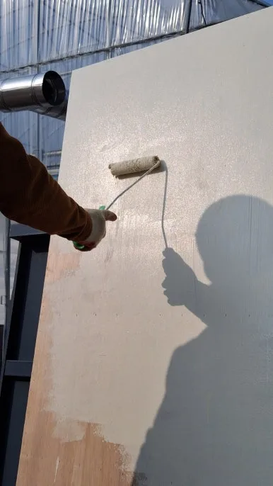 문틀 위치에 고정하고, 페인트칠까지 완성했다. 욕실 쪽은 나무판자로 깨끗하게 마감했다. 욕실 쪽 벽체 반사필름 붙인 곳에 반사 필름이 떨어지지 않도록 타카로 고정했다. 그 위에 플라스틱 방수 마감재인 리빙 보드를 붙이면 벽체가 완성된다.