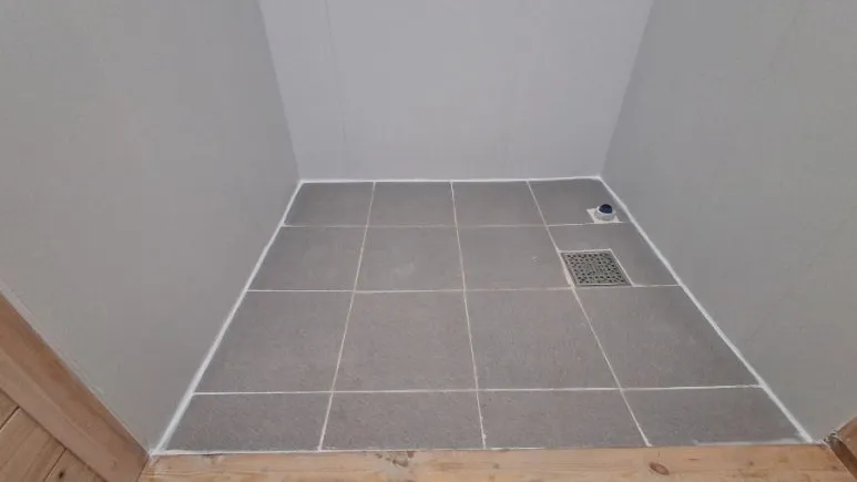 [26.1.13.] 세면장 천장에 몰딩, 바닥과 벽체의 옆에 실리콘 작업으로 마무리했다.