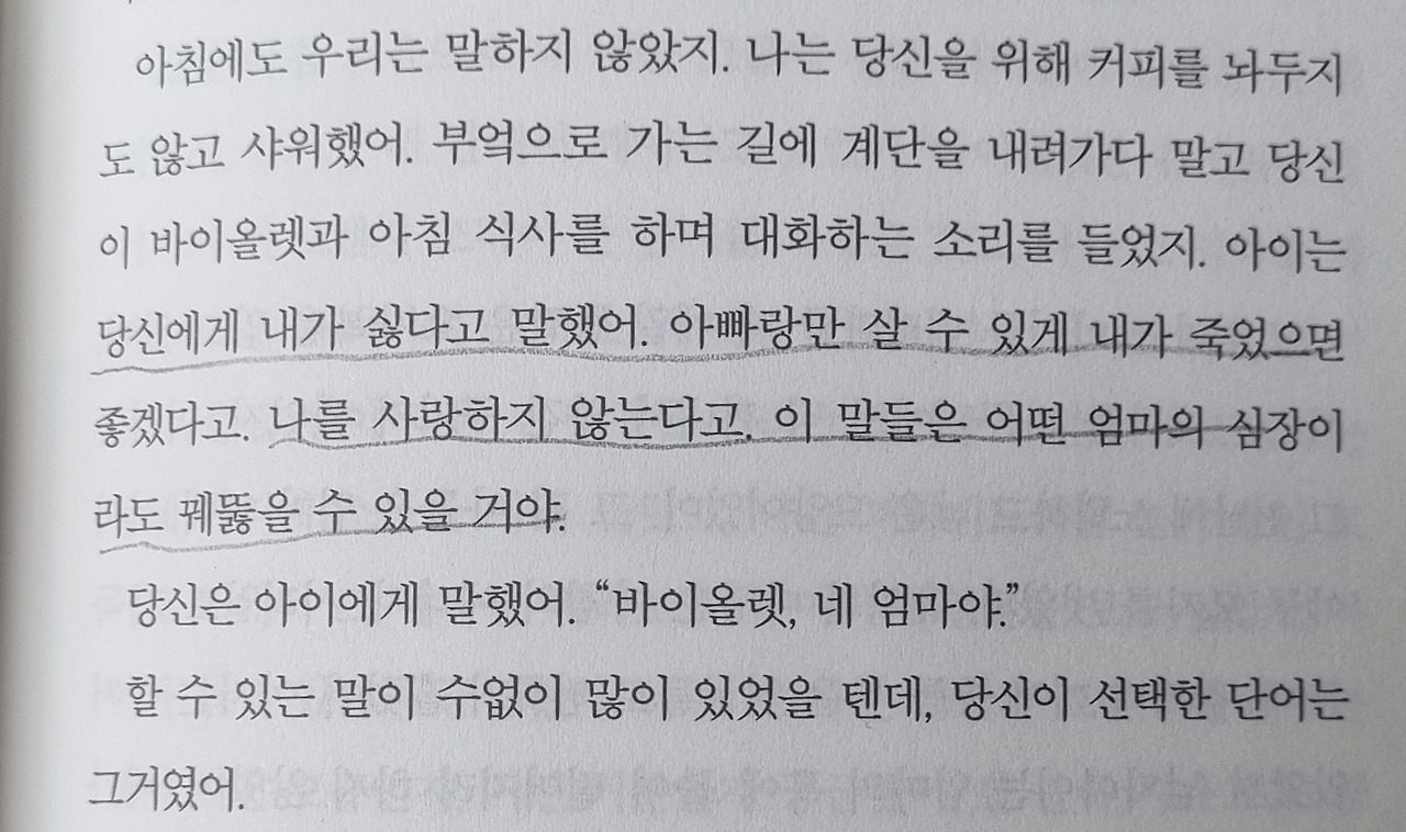 책을 읽으면서도 혹시, 블라이스의 기억이 잘못된 것은 아닐까, 블라이스가 너무 예민해서 딸을 의심하는 것은 아닐까 생각이 들 정도였다. 그렇지만 나는 블라이스에 몰입되었기 때문에 바이올렛을 어쩌면 좋을지 너무 걱정되었다. 사회적으로 강요되는 모성의 이면에 존재하는 한 여성의 깊은 내면과, 어머니들의 삶과 굴레들이 구체적으로 그려진 책의 내용을 따라가며 긴장과 탐색의 시간이었다.