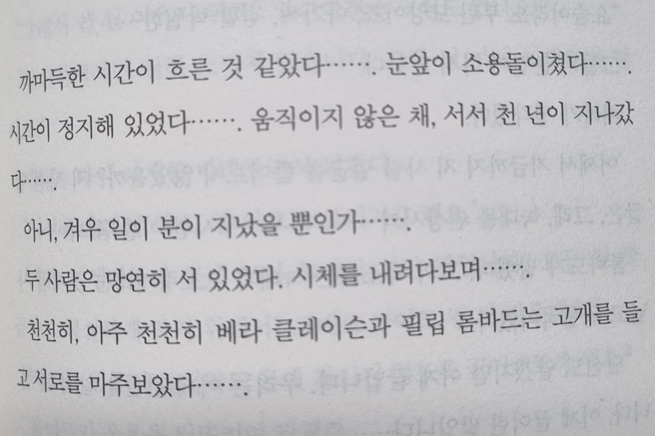 셜록 홈스와 괴도 뤼팡을 무척 좋아해서 열심히 읽었던 어린 시절이 있었다. 복선을 생각하며 누가 범인일지 맞히며 읽는 재미가 있었다. 이번 책은 소설 쓰기를 배우면서 읽게 되었다. 한 사람씩 죽어가는 상황이라 긴장하며 읽을 수밖에 없었는데 말미에 가도록 누가 범인인지 미궁이라 내용이 궁금해서 책을 놓을 수 없었다. 평소의 책 읽기에서도 잘 접하지 않던 장르라 마치, 잠시 여행을 다녀온 느낌으로 읽었다.