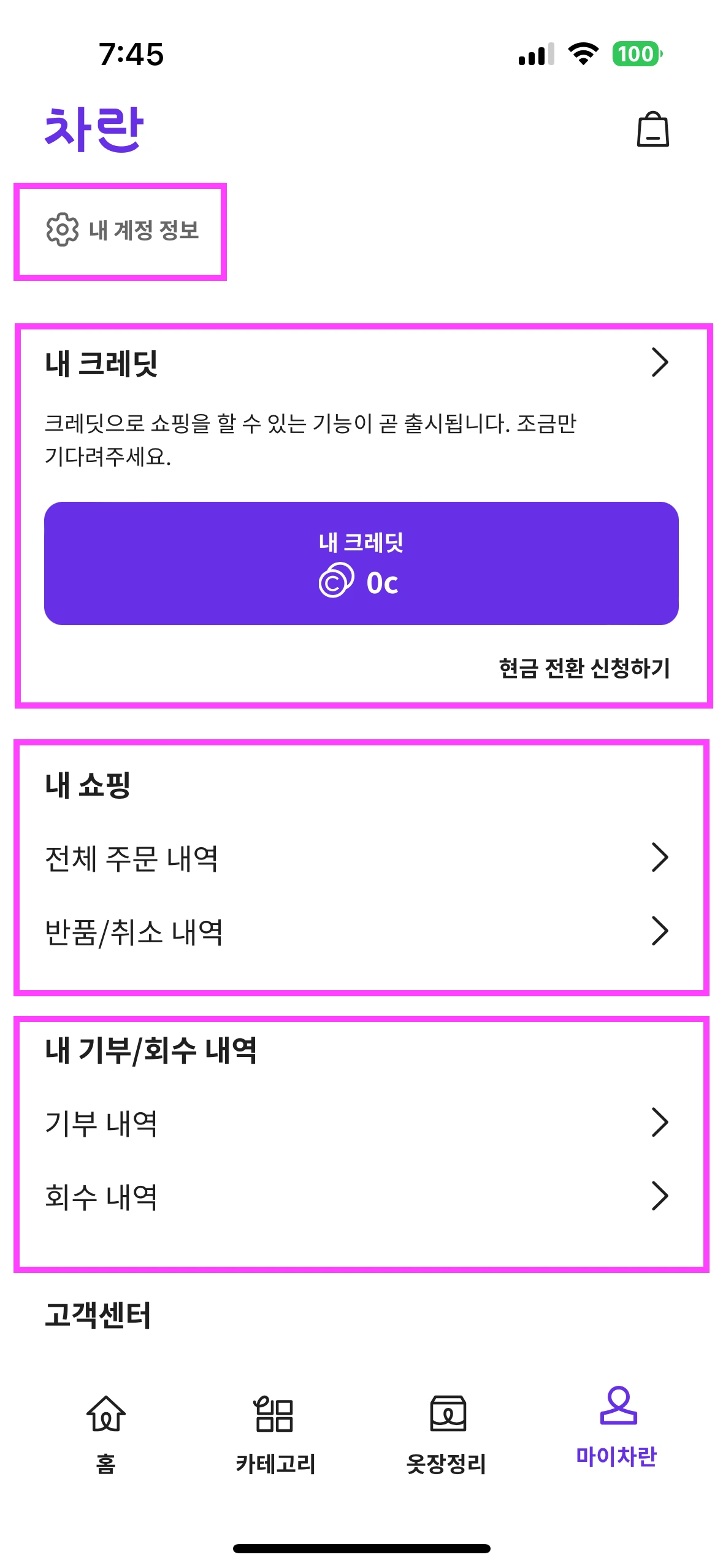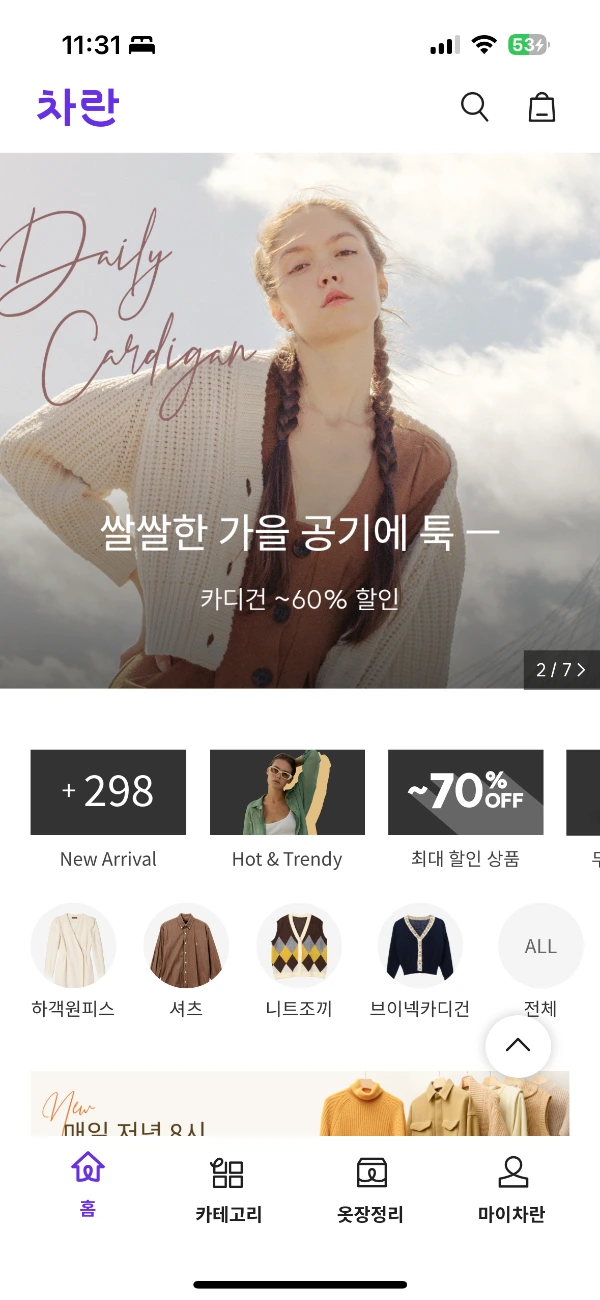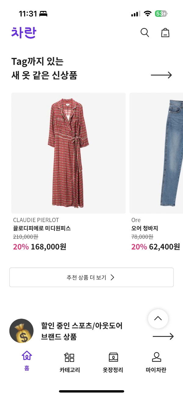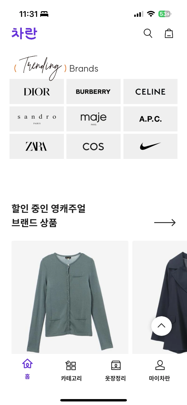차란의 GNB는 심플하다. 홈, 카테고리, 옷장정리, 마이차란으로 구성되어 있다.
