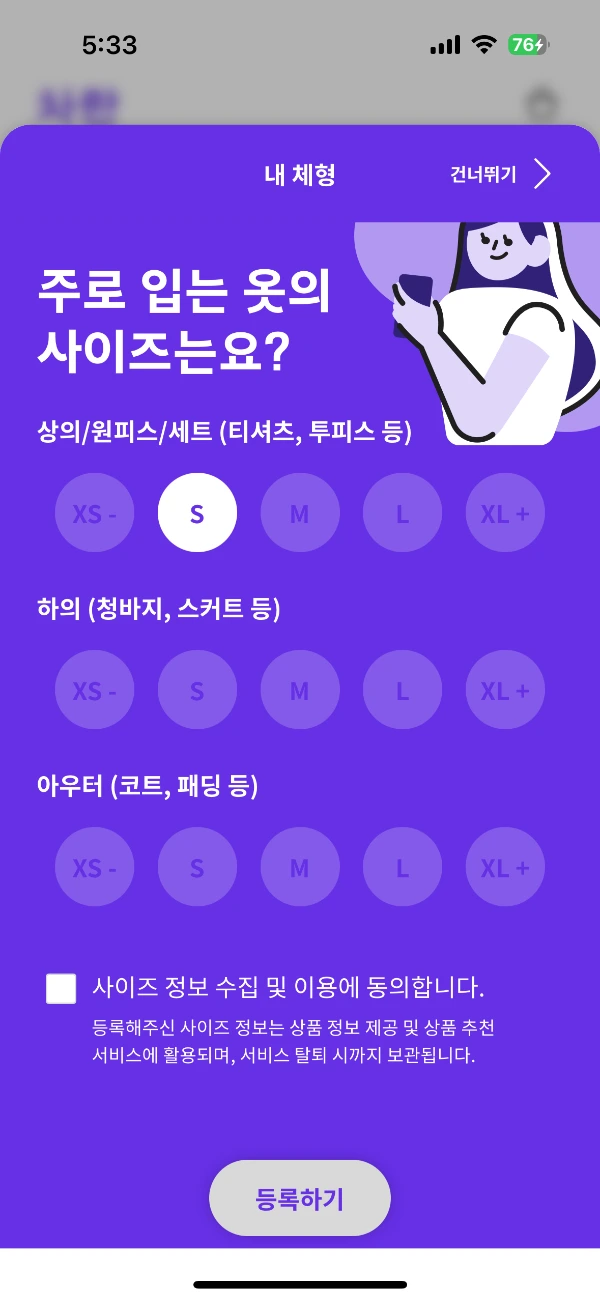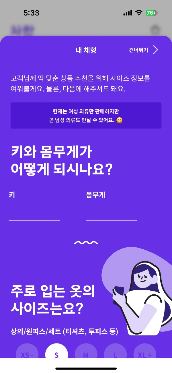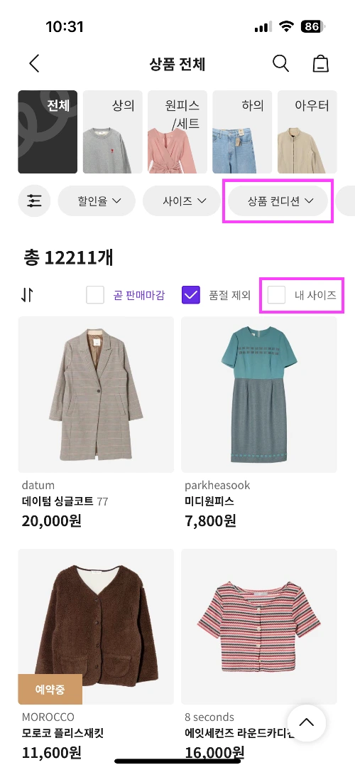 그리고 차란의 필터에서 재미있었던 부분은 '상품 컨디션'이 존재한다는 점과 '내 사이즈'라는 필터가 전면에 노출된다는 점이었다. 중고 의류 상품의 경우 상품의 컨디션이 각 상품마다도 다를 것이고, 여러 사이즈가 있는 것이 아니기 때문에 두 필터를 사용자의 눈에 잘 띄는 곳에 배치했다는 점이 흥미로웠다.