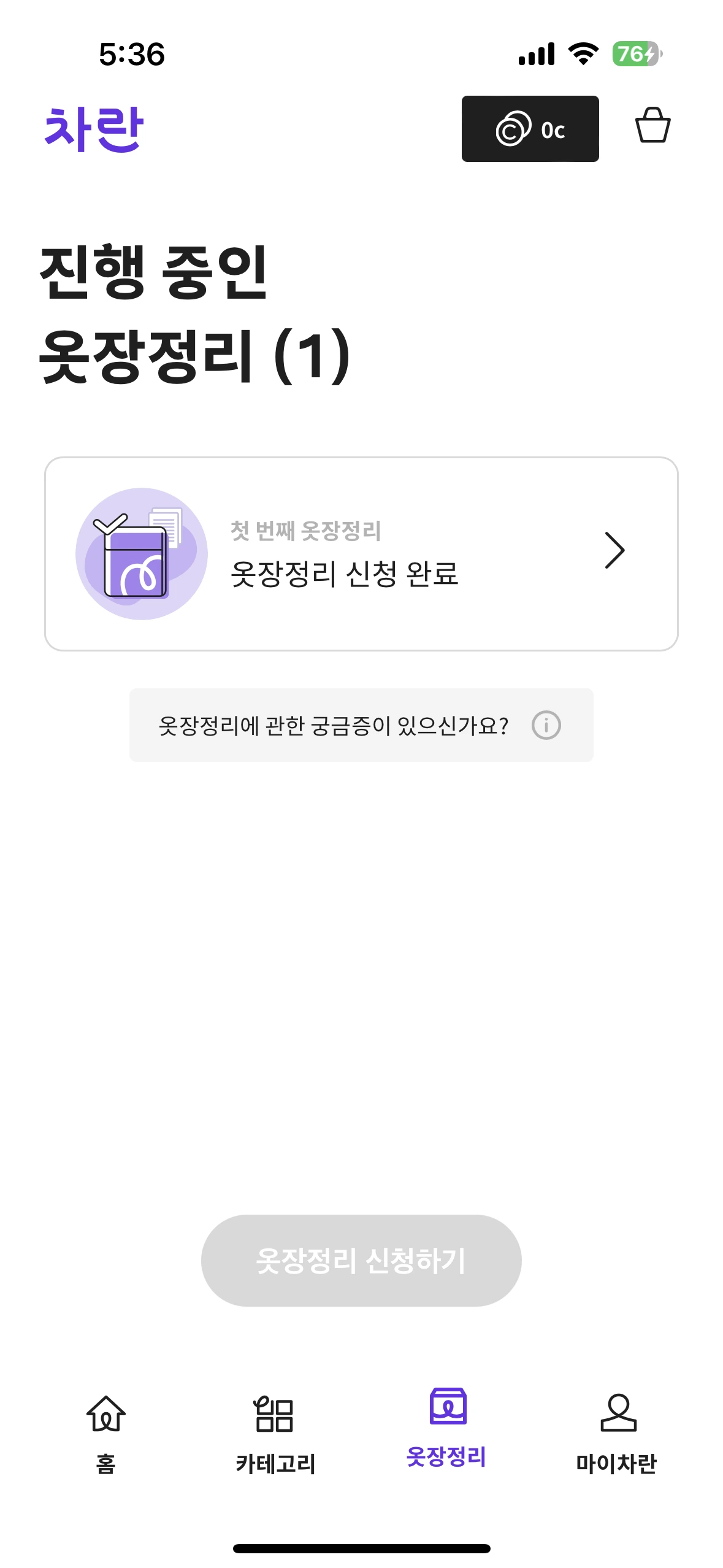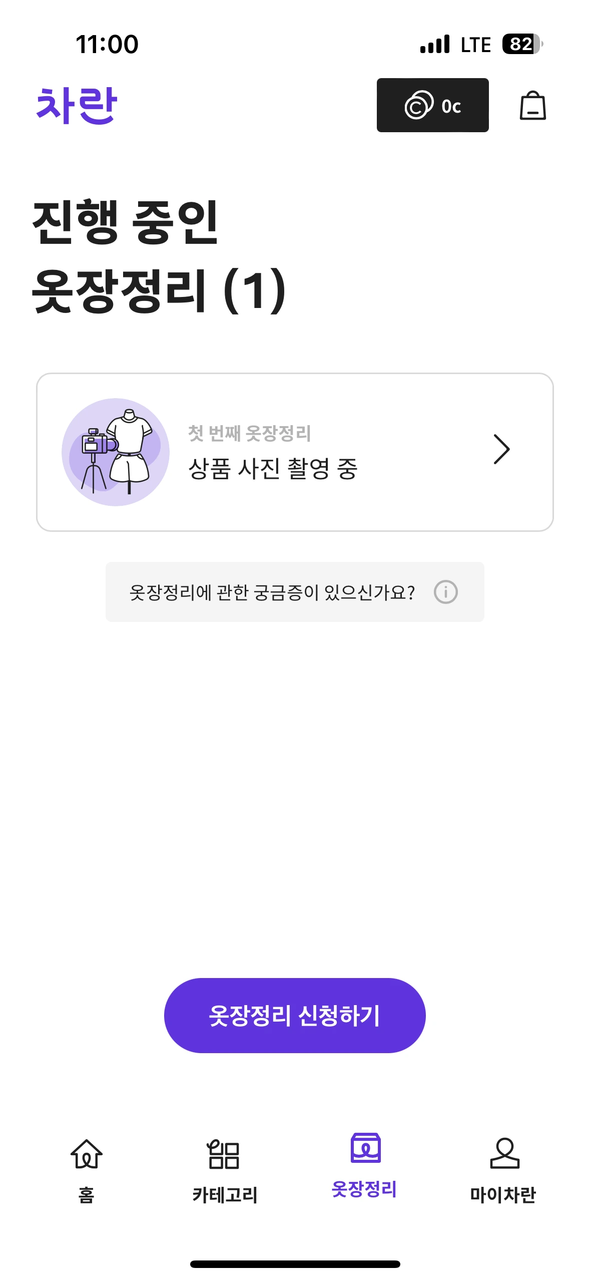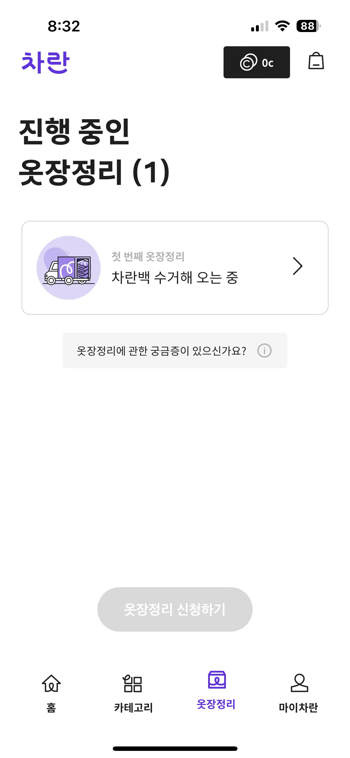 1. "차란"앱의 옷장정리 탭에서 옷장정리를 신청한다. (버튼)