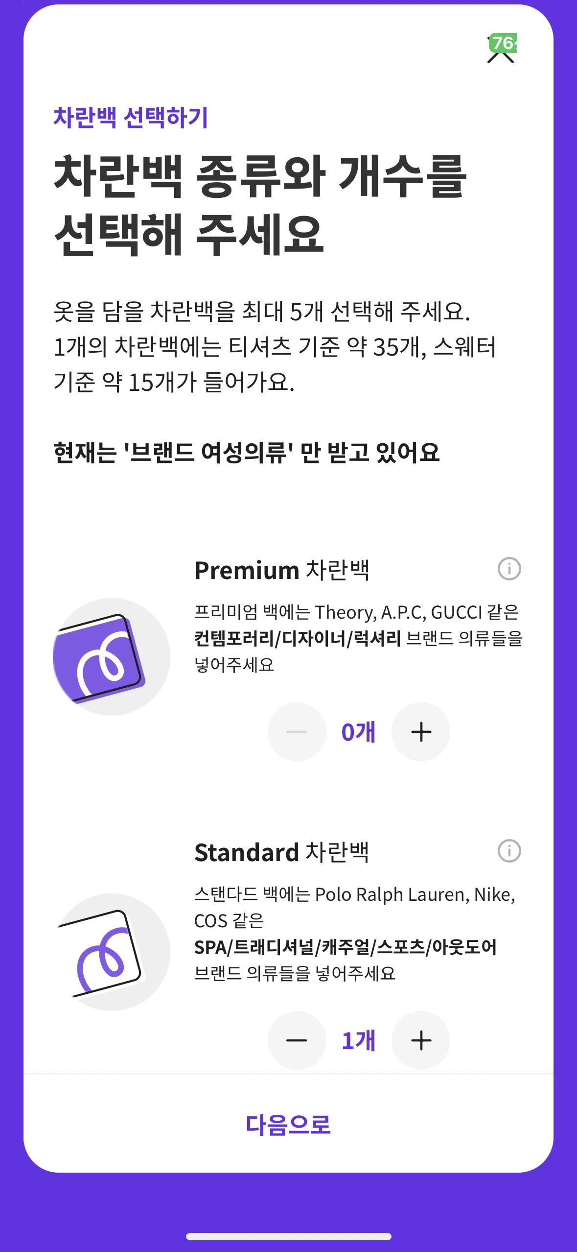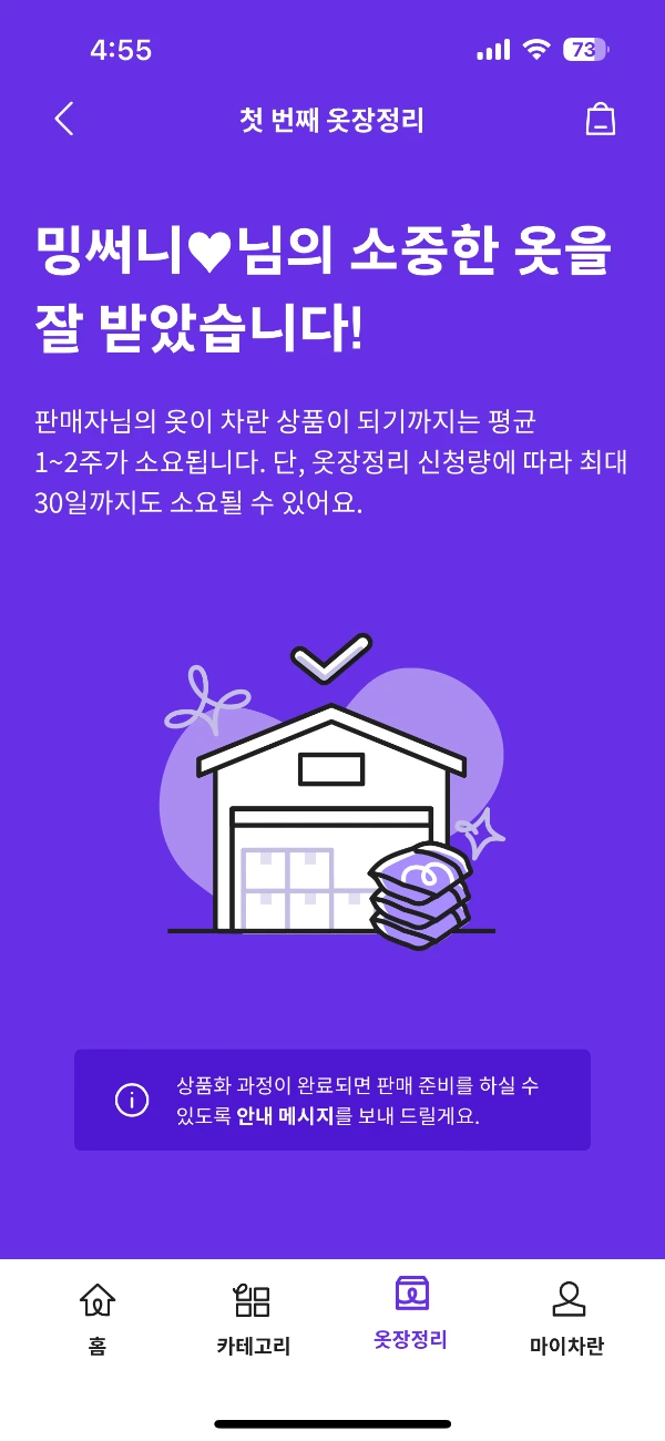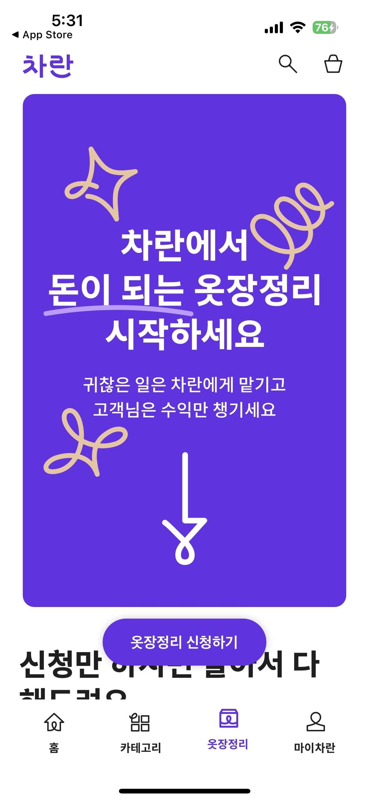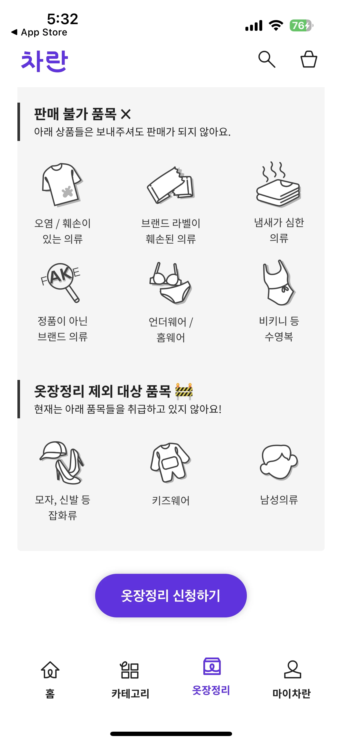 1. "차란"앱의 옷장정리 탭에서 옷장정리를 신청한다. (버튼)