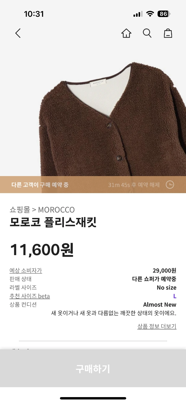 이 상품을 다른 사람이 장바구니에 담게 되면 "다른 쇼퍼가 예약 중"이라는 상태로 변경이 되고, 썸네일에도 예약 해제까지 남은 시간을 노출해준다. 디테일하게 시간까지 노출된다는 점에서 사용자들에게 유용한 피처라는 생각이 들었다.