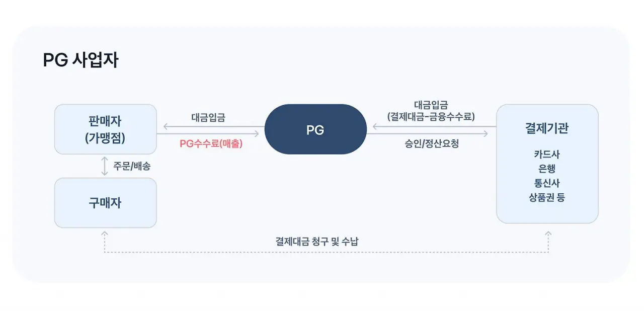 커머스에서 모든 카드 회사와 결제 수단을 연결하려면 많은 시간과 돈과 전문 인력들이 필요하다. 이런 역할을 대행해주는 것이 PG(Payment Gate)이다. 이커머스 서비스는 PG사와 계약을 맺고, 한 번에 온라인 결제 시스템을 도입할 수 있다.