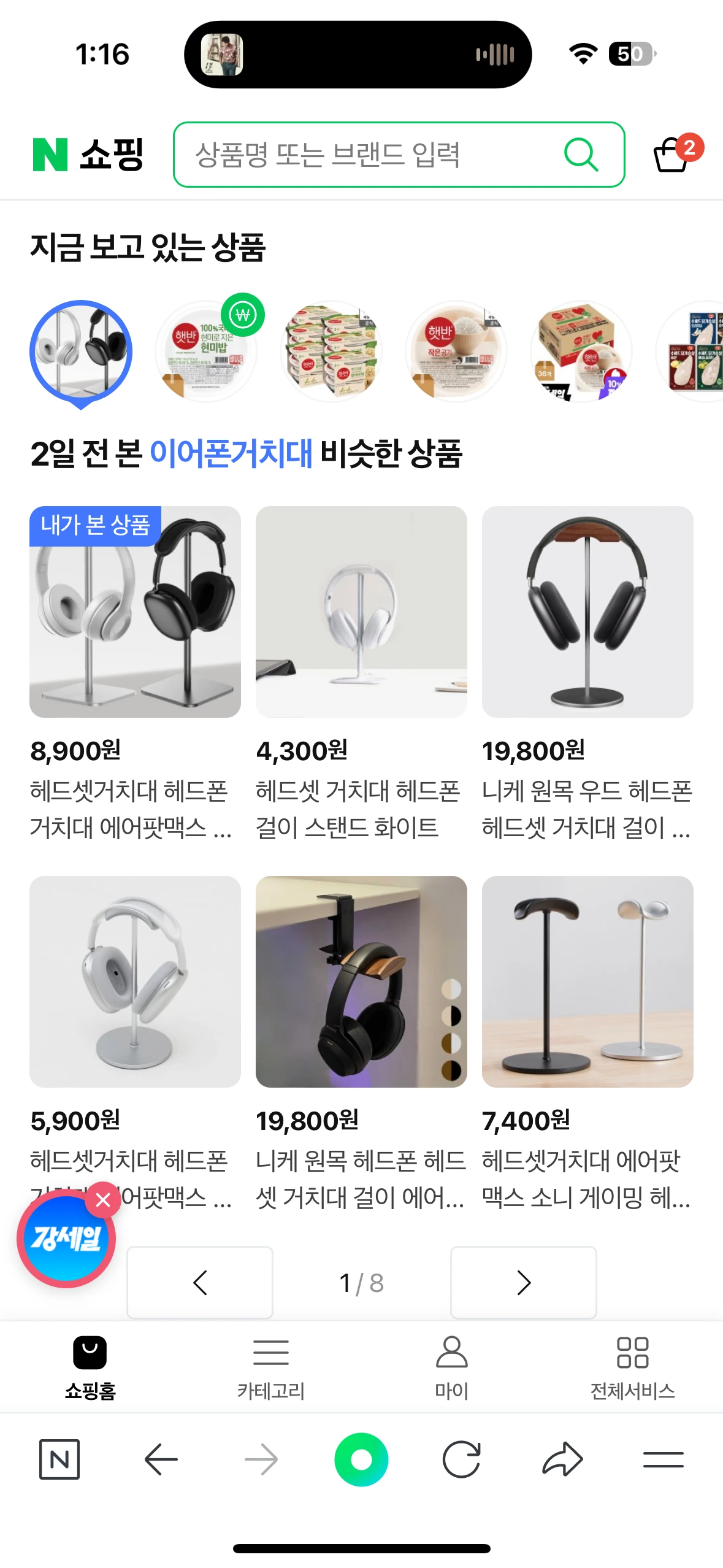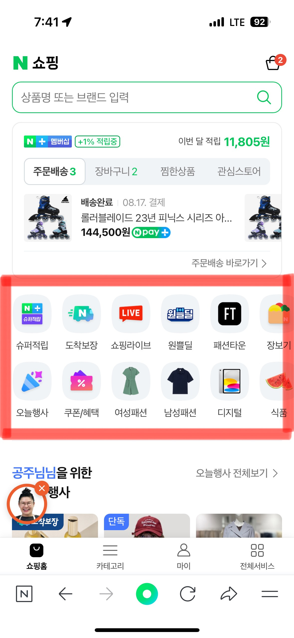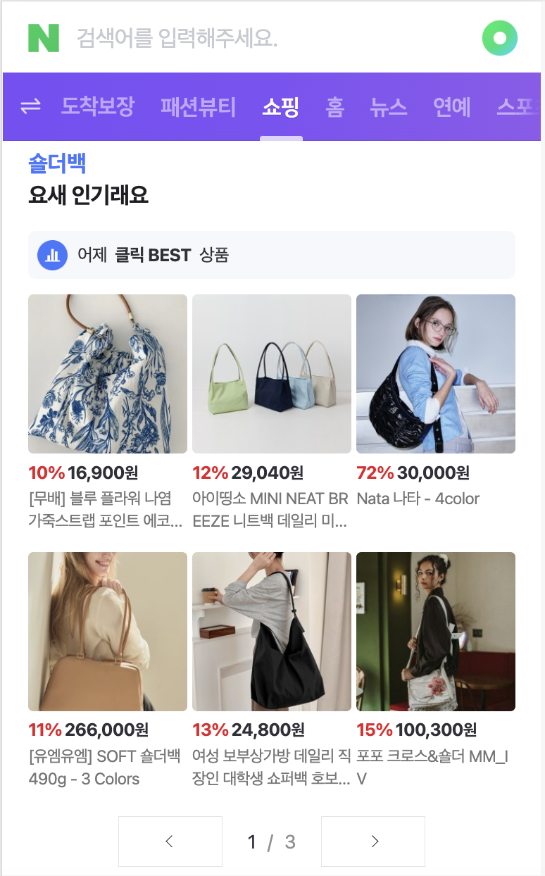 네이버 쇼핑홈의 퀵버튼에는 네이버의 다양한 서비스 (원쁠딜, 도착보장) 들을 보여주는 코너 위주로 구성이 되어 있어 공급자 관점이라는 생각이 들었다. 여러 추천 요소로 '발견'하는 건 쉽게 갖춰두었지만 '탐색'하기에는 어려운 구조로 느껴졌다.