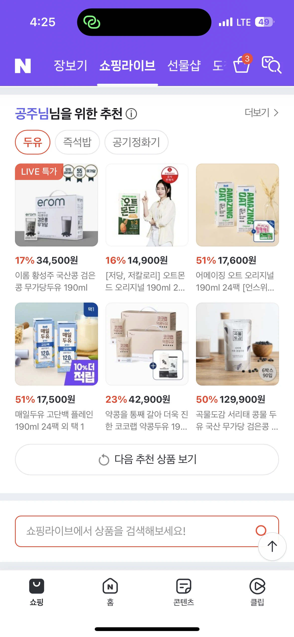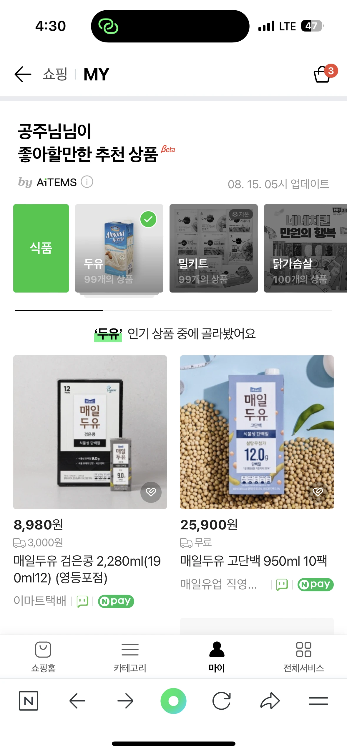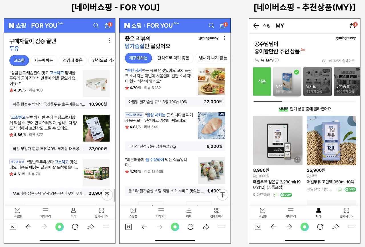 네이버 쇼핑 홈에서 '추천쇼핑'이라는 탭을 클릭하면 MY 영역의 'OO님이 좋아할만한 추천 상품' 영역으로 이동한다. 이 영역에서는 '식품 > 두유', '패션 > 티셔츠' 등 카테고리 2depth를 기준으로 인기 상품을 리스트화해서 보여주고 있었다.