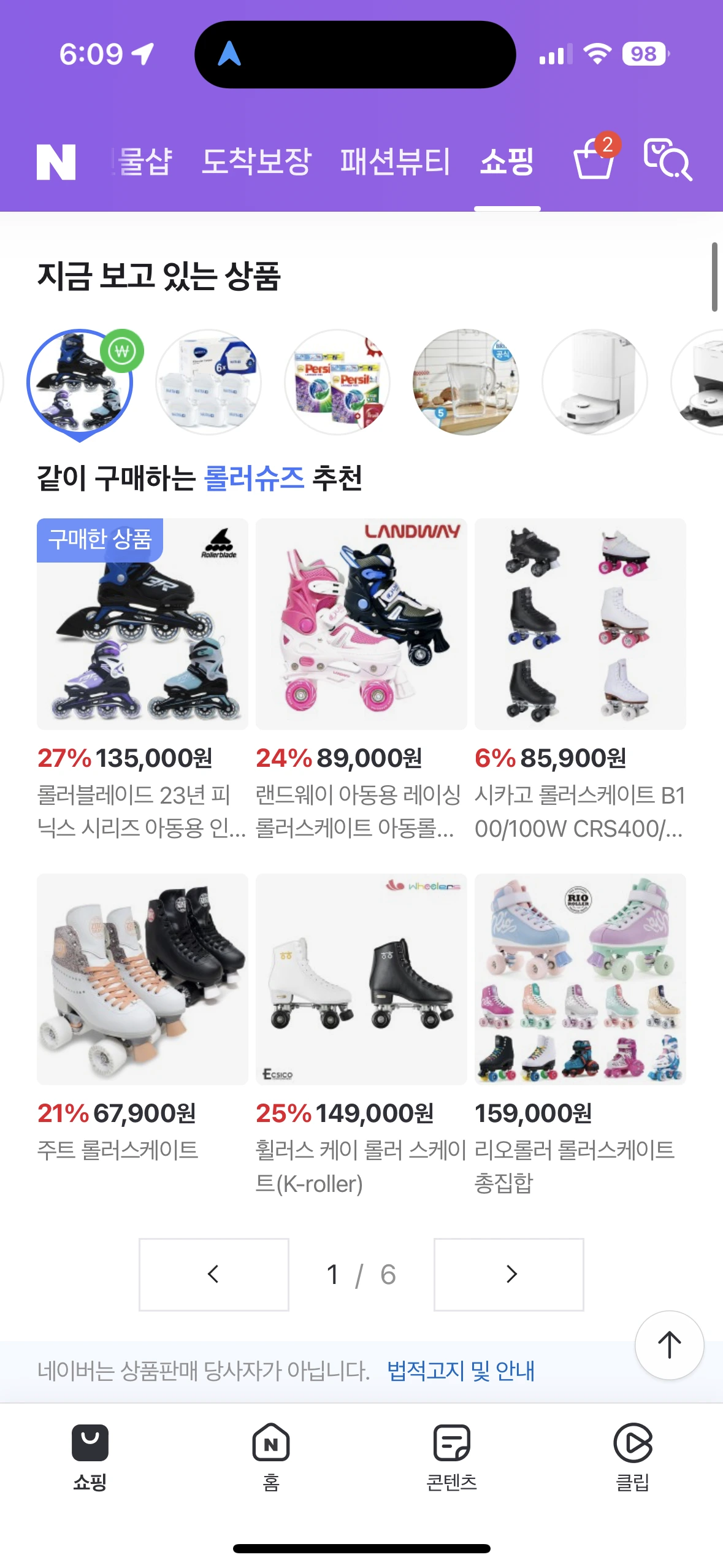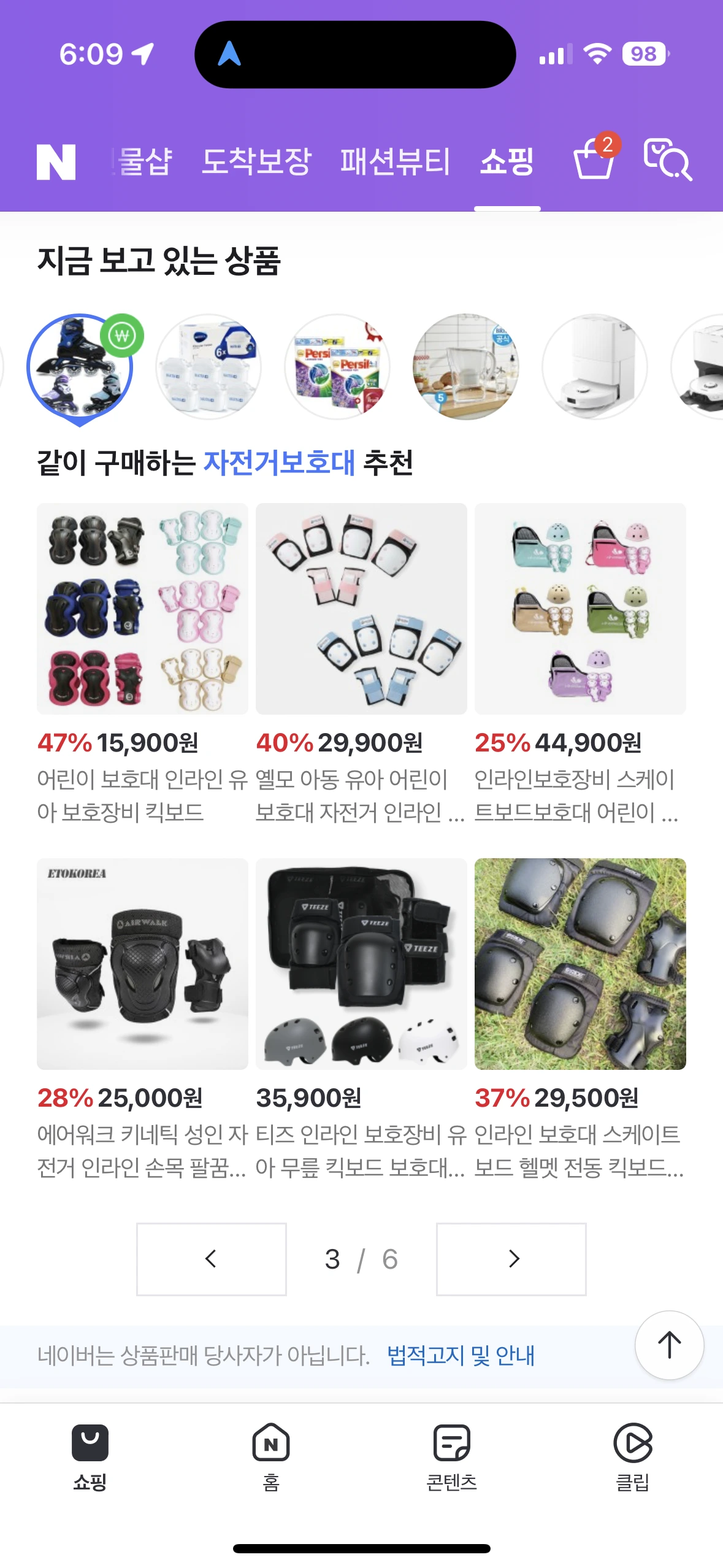 추천영역 앞에는 롤러슈즈 추천, 뒤 페이지에는 자전거보호대 추천