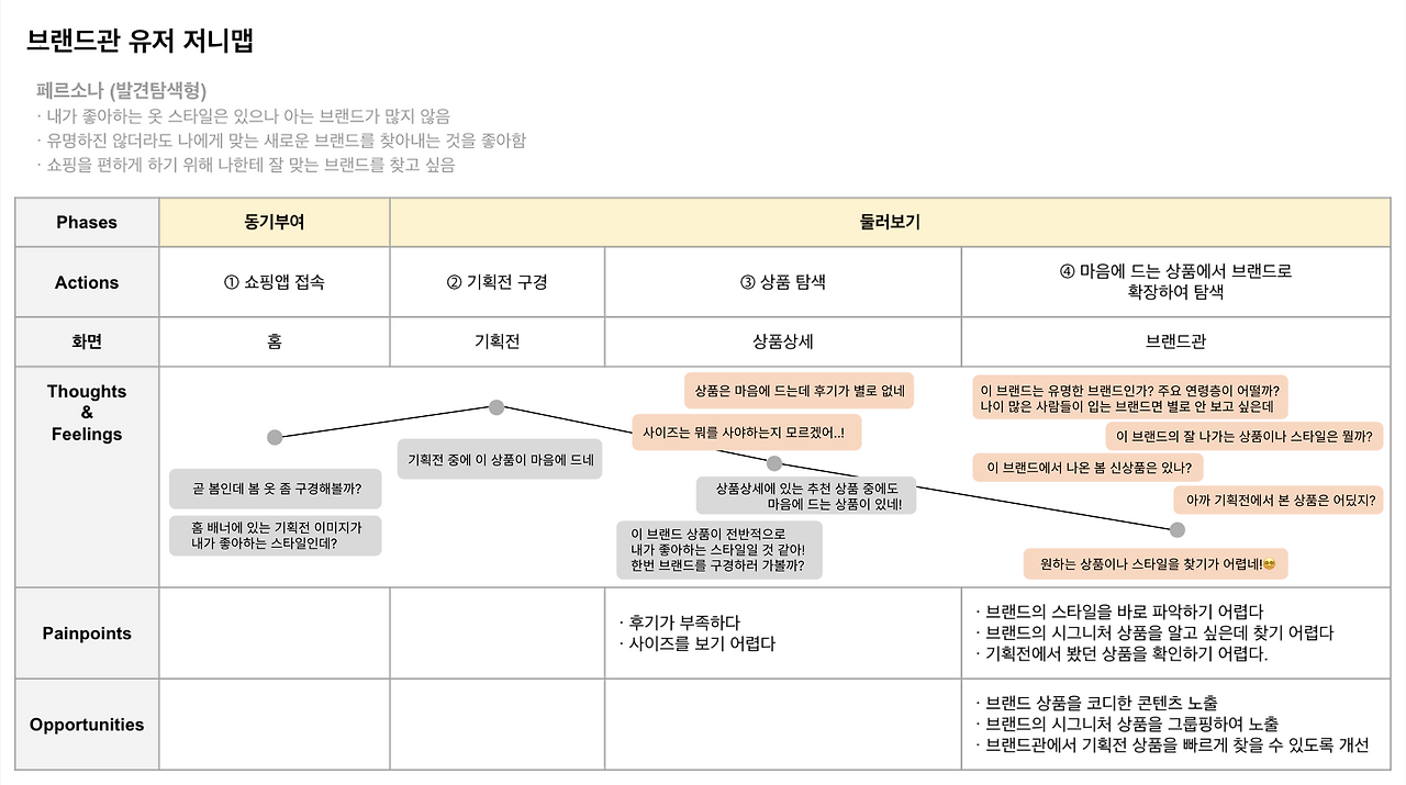 이러한 유형의 사용자는 앱에 접속하여 홈 등을 둘러보면서 진행하고 있는 이벤트나 기획전은 무엇이 있는지 확인하거나 괜찮은 상품을 발견하면 비슷한 상품이나 브랜드로 추가 탐색을 이어갈 가능성이 많다. 이 과정에서 새로운 브랜드를 발견하는 경험도 많을 것이다. 이 케이스의 유저저니맵을 작성해보았다.