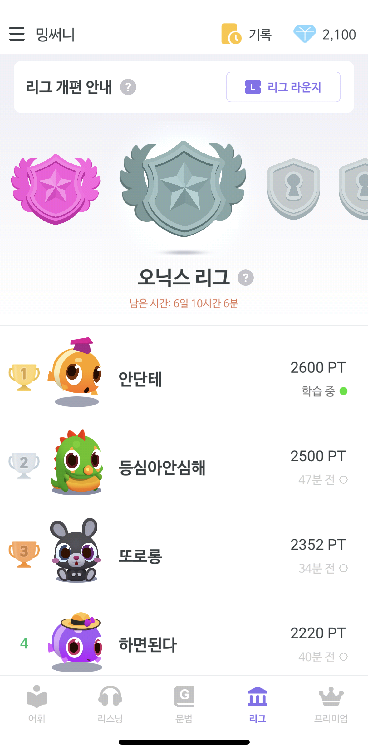(2) 말해보카 앱은 며칠간 접속하지 않으면 ‘앱푸시’를 통해 접속을 유도한다. 앱을 사용하게 되면 다른 사용자들과 점수를 대결하면서 등급이 승급하거나 강등하는데 이는 사용자의 내적 계기를 유발한다. 또한, 내가 학습하던 데이터가 쌓여있어 다른 보카앱으로 전환하기에 전환비용이 많다고도 할 수 있다. 이 앱에는 게임화적인 요소도 있다. Point와 Badge를 제공하는 점이 ‘외적보상’을 잘 마련하는 요소하고 할 수 있다.