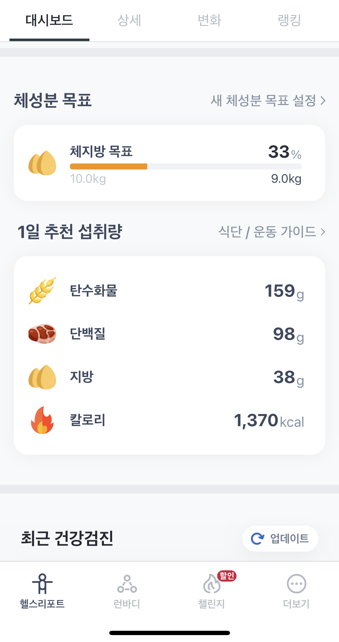 (1) 인바디 앱에서는 개인이 ‘목표’를 설정하면 목표를 달성하기 위한 1일 섭취량과 운동 ‘방법’을 알려준다. 중간에 인바디를 측정한다면 진척율(피드백)을 보여준다.