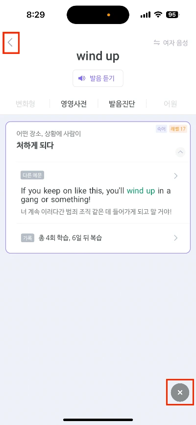 말해보카 : 뒤로가기도 있지만 한손으로 사용 시 닿기 어렵다. 오른쪽 하단에도 닫기버튼을 노출하고 있다. 사용자의 사용성을 고려한 버튼 위치라고 생각된다.