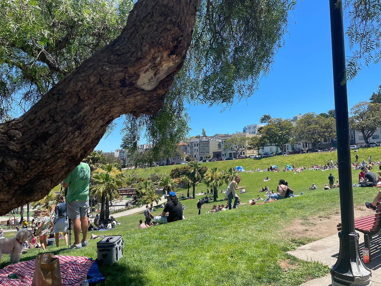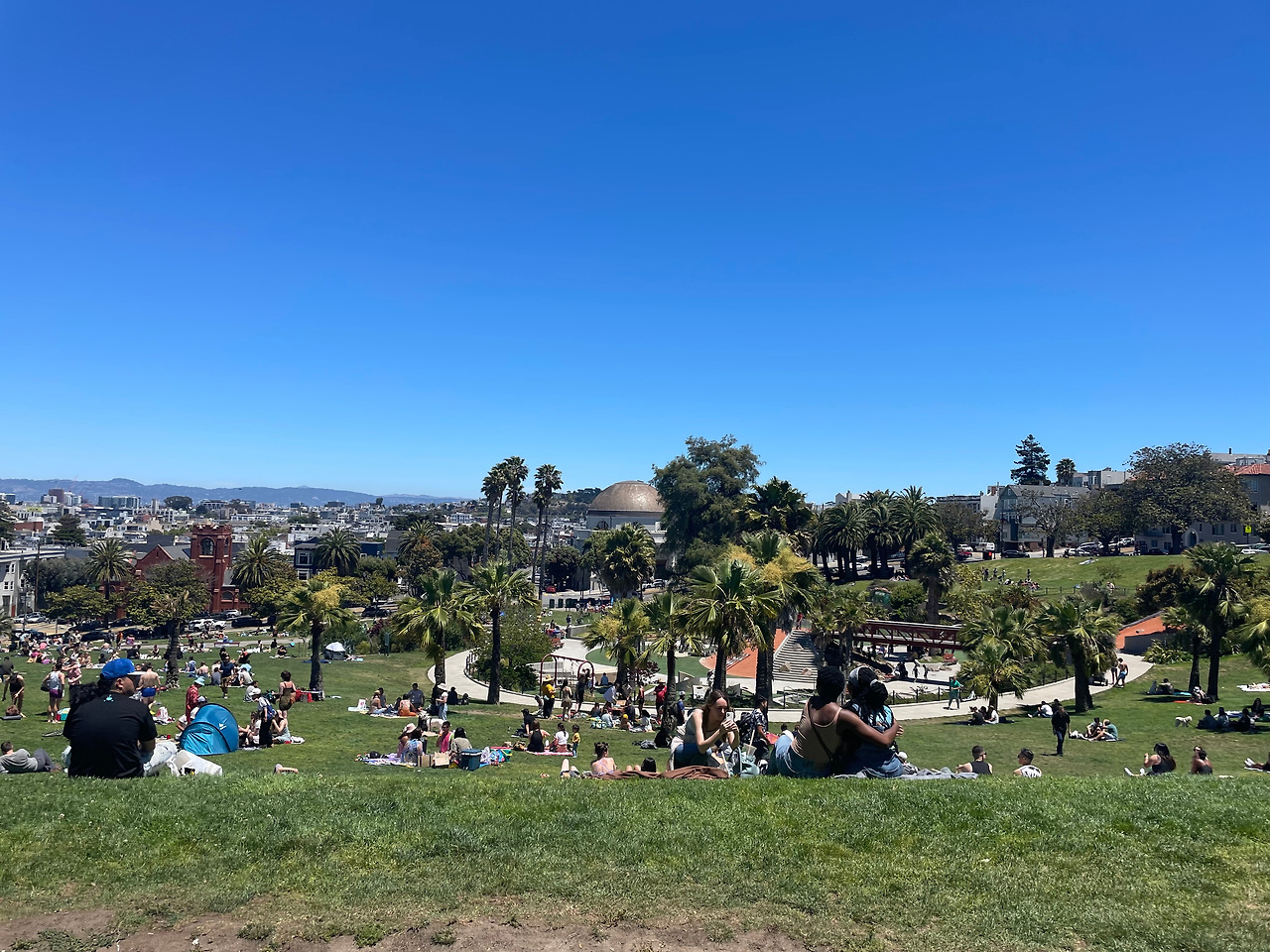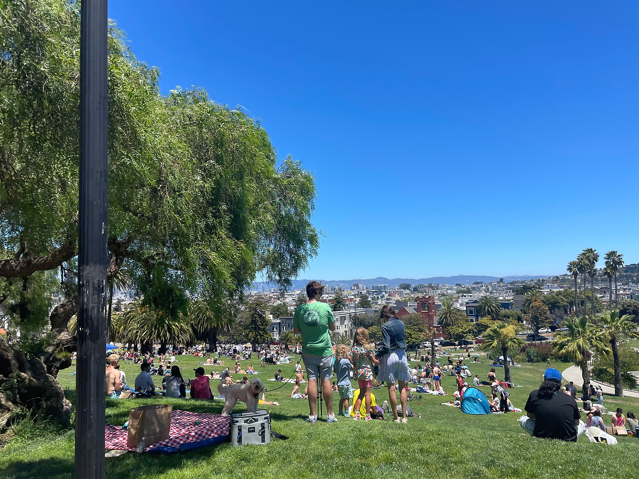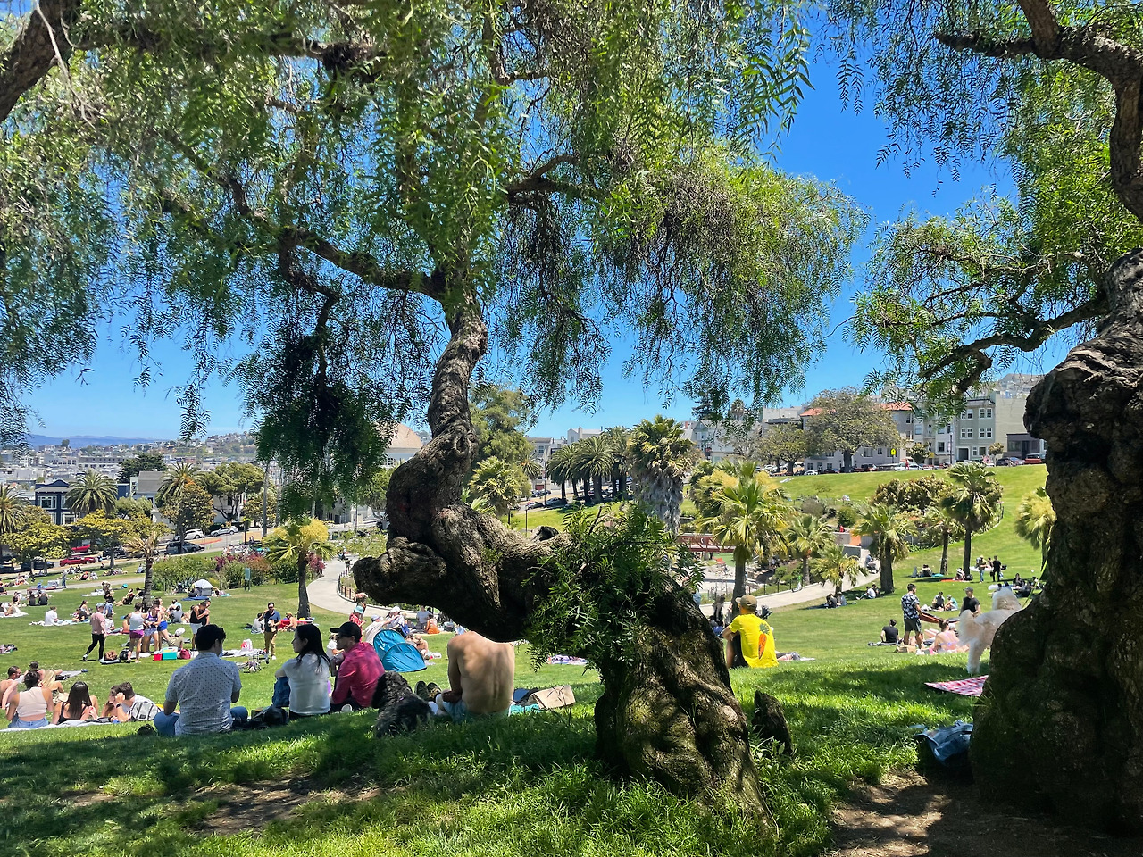 다 먹고 자리를 이동해서 20분 정도 거리의 미션 돌로레스 파크에 도착했다. 피크닉에서 시원한 음료가 빠질 수가 있겠는가. 근처 카페에서 커피를 한 잔씩 픽업해왔고, 따가운 햇볕에 금새 녹았지만 아무래도 그런 것은 괜찮았다.