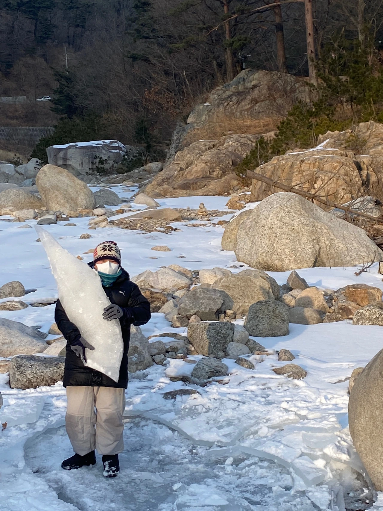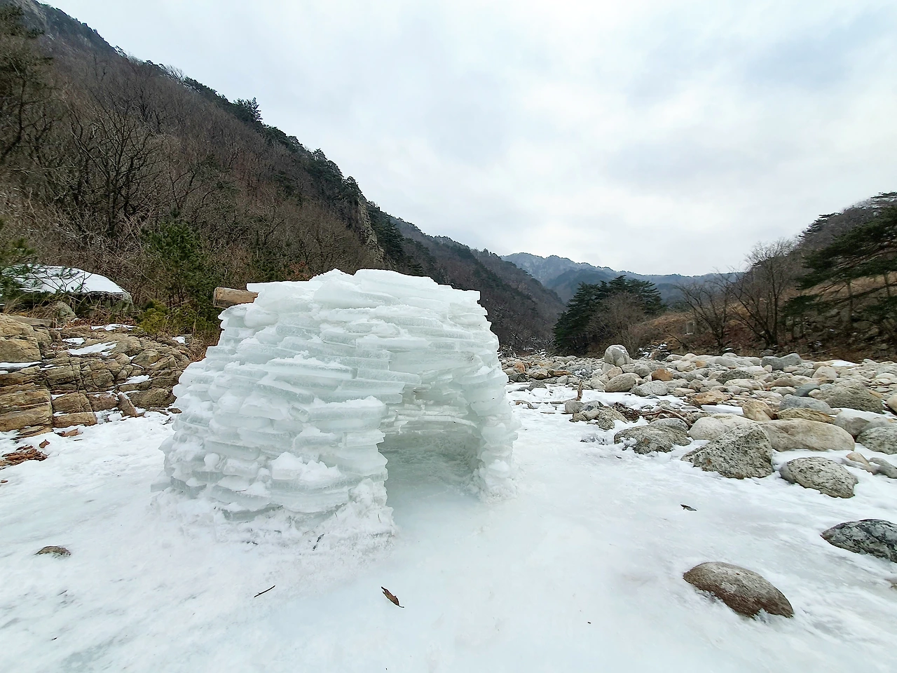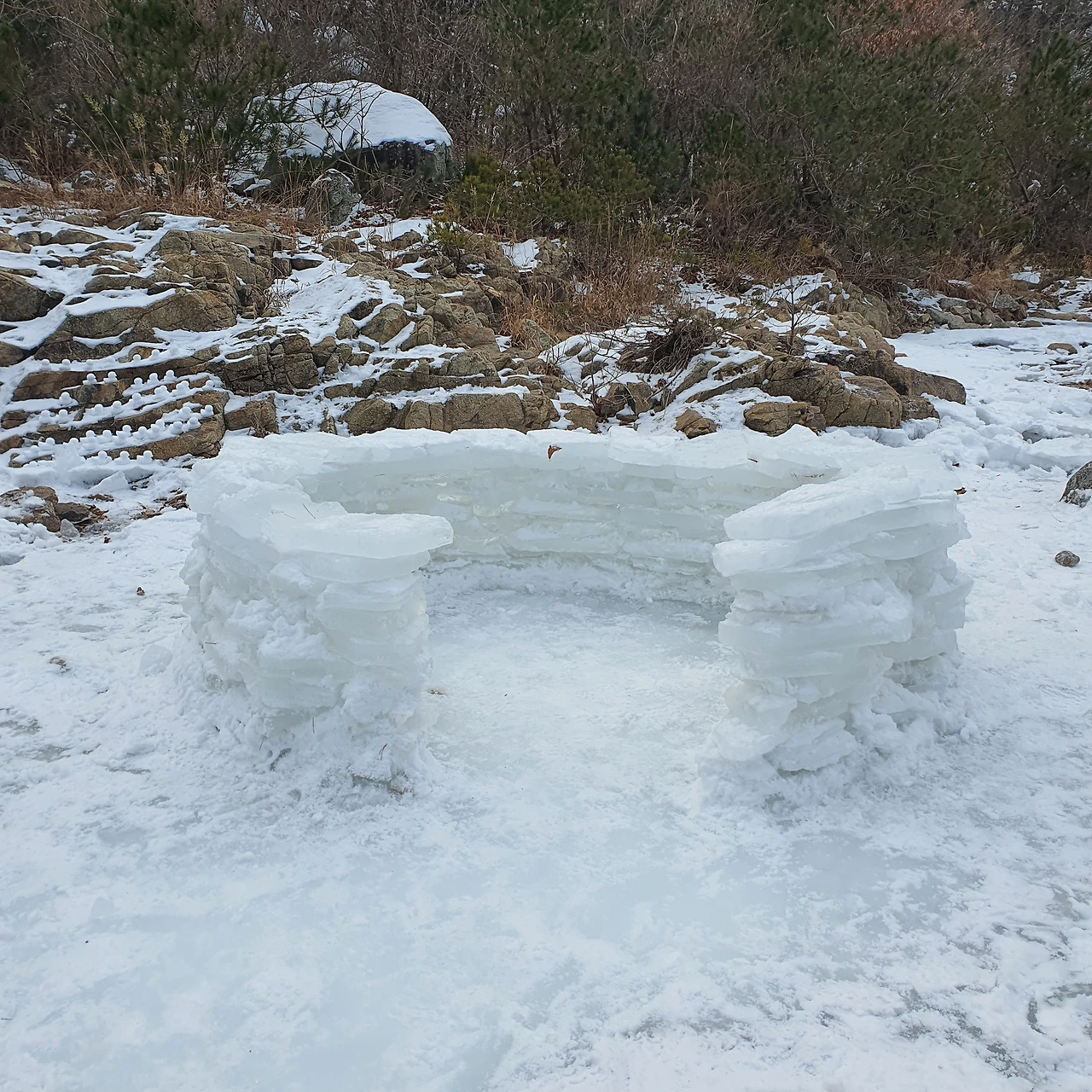 한참을 눈덩이를 뭉치며 놀던 아이들이 이번에는 얼음을 깨기 시작했다. 계곡 물이 여러 번에 걸쳐 얼어붙었는지, 10cm 정도로 고른 두께의 판 얼음들이 끝도 없이 깨져 나왔다. 판 얼음을 가지고 무엇을 할까 고민을 하다가, 이글루를 짓기로 하였다. 그때까지만 해도 이글루가 얼음으로 짓는 것이라 생각했는데, 나중에 보니 유튜브나 인스타에 나오는 이글루 짓기는 전부 눈으로 만드는 거였다. 하긴 이렇게 많은 얼음을 공급할 수가 없을 테니 방법이 없을 테지. 그렇게 내가 알기로는 국내 최초, 자연산 얼음으로 만드는 이글루 제작이 시작되었다.