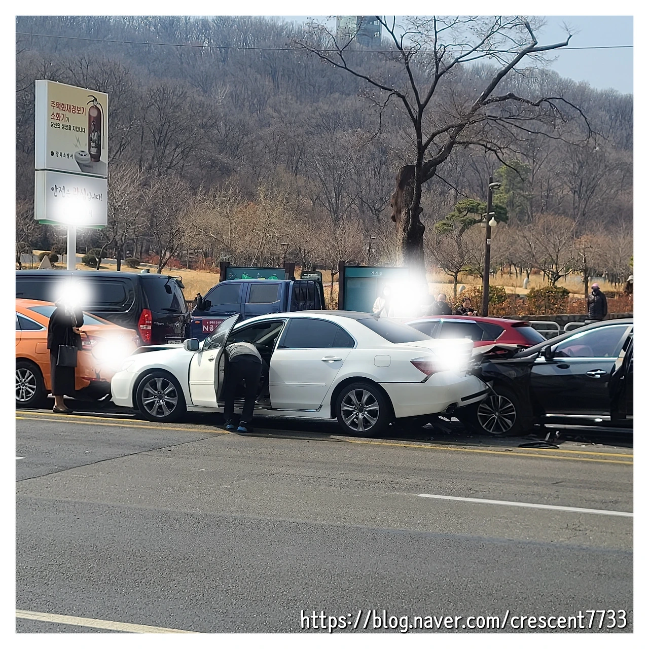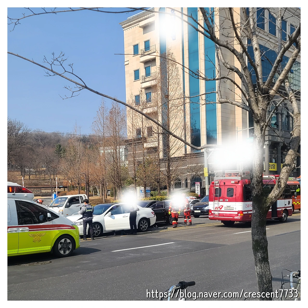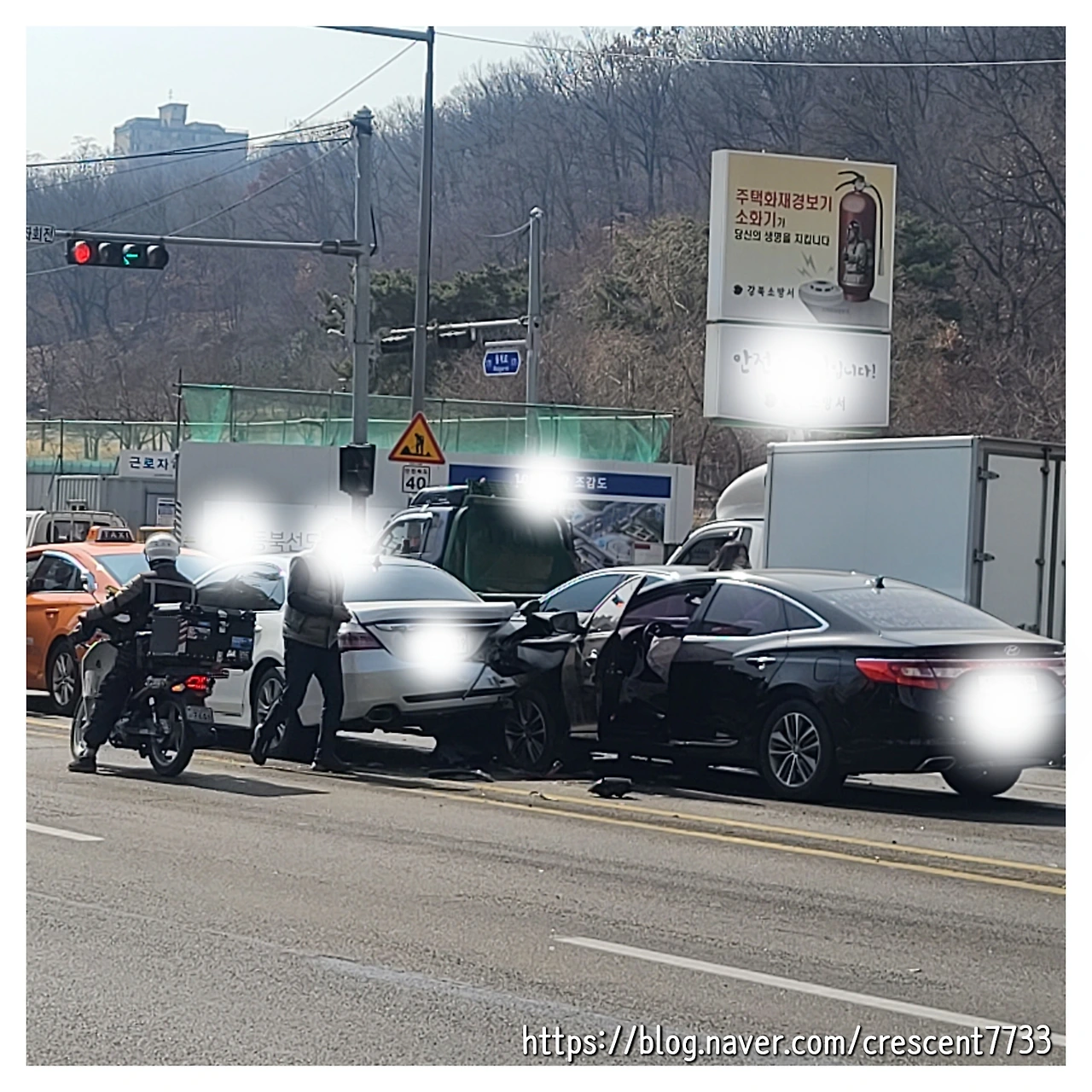 좌회전 신호를 기다리던 하얀색 차량이 뒤에 오던 검은색 승용차에 심하게 부딪혀 그 앞에 있던 택시까지 받는 3중 추돌사고였다. 사고를 낸 뒤 검은색 차량의 승용차에서 아주머니가 내리더니 무척이나 당황한 표정과 몸짓으로 이리저리 둘러보며 어딘가로 정신없이 전화를 하는 모습이었다. 부서진 자동차의 파편은 사방으로 튀었고 금세 사람들이 모여서 북적거렸다. 근처에 있던 경찰이 2~3분도 채 되지 않아서 사고 현장에 도착하였고 5분쯤 지나니 119 구급대와 소방차가 왔다.