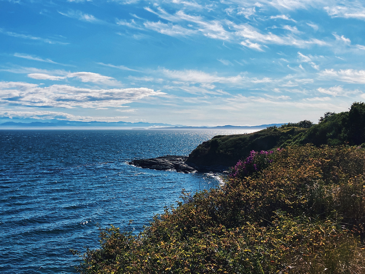 여행 루트는 심플했다. 딱히 관광지를 가고 싶은 것은 아니어서 Butchart Garden은 포기(뚜벅이로 가기엔 약간 멀었다). 도착하자마자 유명한 피시 앤 칩스를 먹었고 다운타운을 걸으며 동네 구경을 했다. 친구의 친구가 일하는 카페에서 커피 한 잔을 마시고 Dallas road로 바다를 보러 갔다. 같은 태평양인데 밴쿠버와는 또 다른, 파랗고 진하고 깊고 거친 바다가 반가웠다. 절벽 아래에 넓디넓게 펼쳐진 바다를 한동안 바라보았는데, 지금 바다 동네에 살고 있는 사람인데도 정말 오랜만에 바다를 만난 기분이라 마음이 벅찼다.