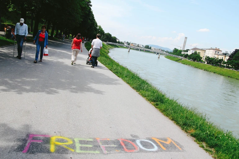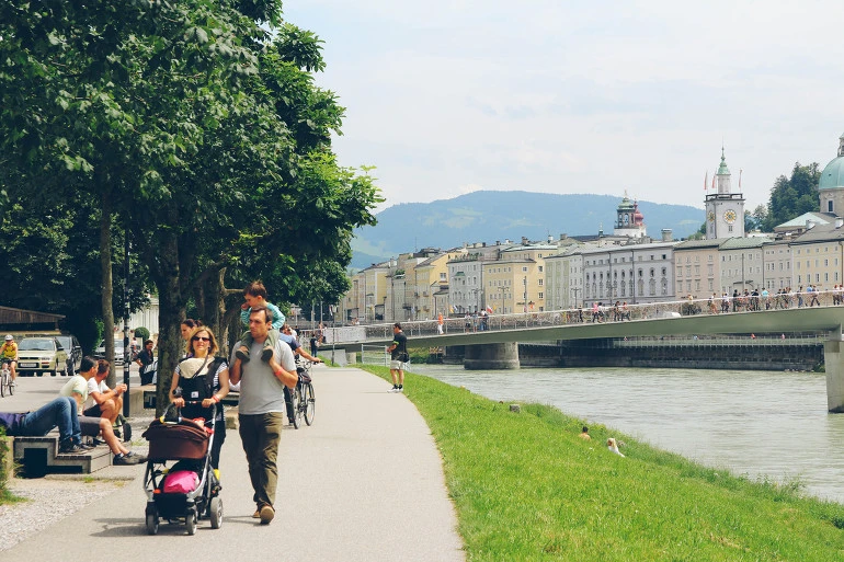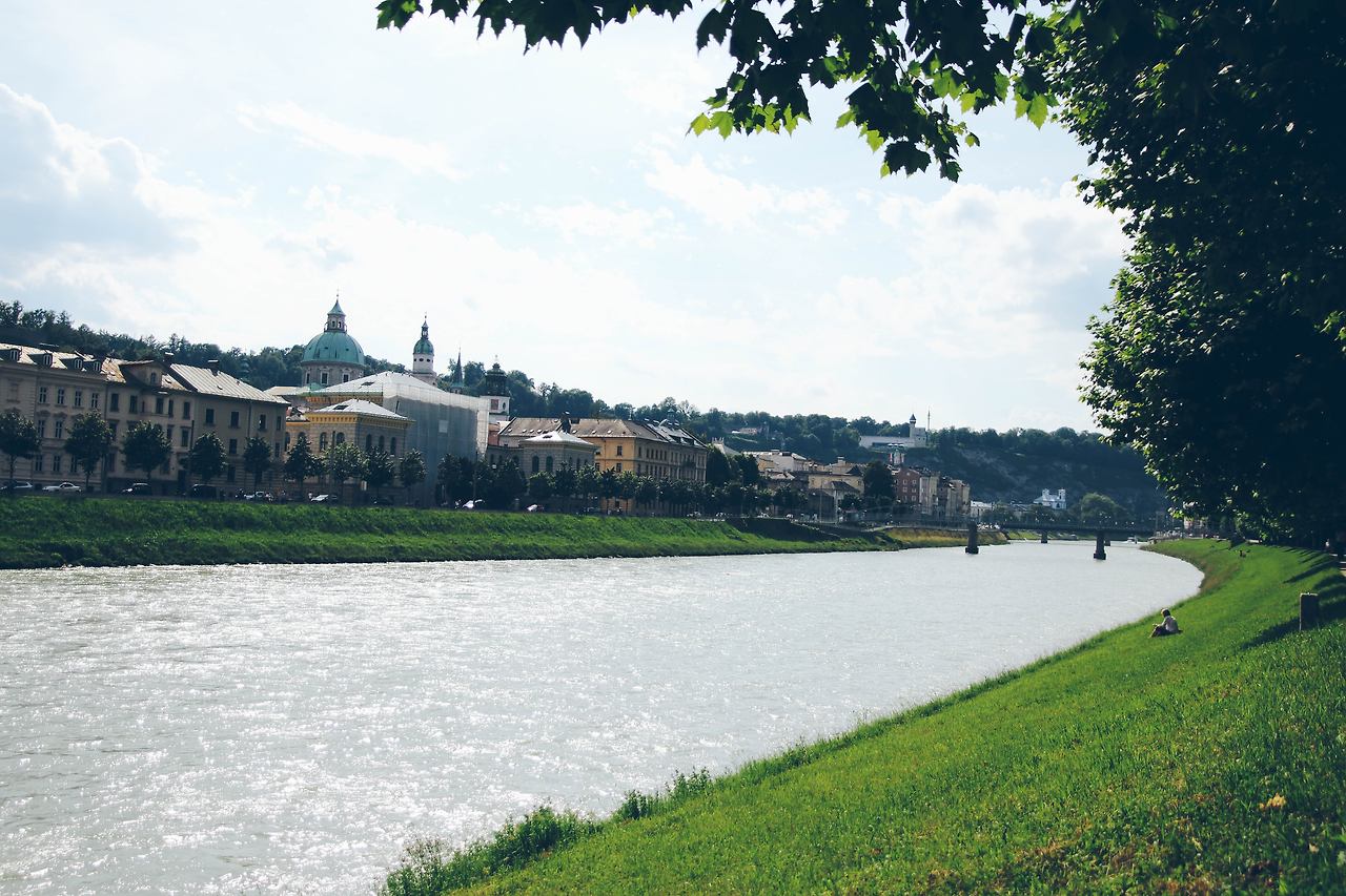잘츠부르크는 딱 이런 분위기. 강물이 반짝이고 사람들은 햇볕을 쬔다.