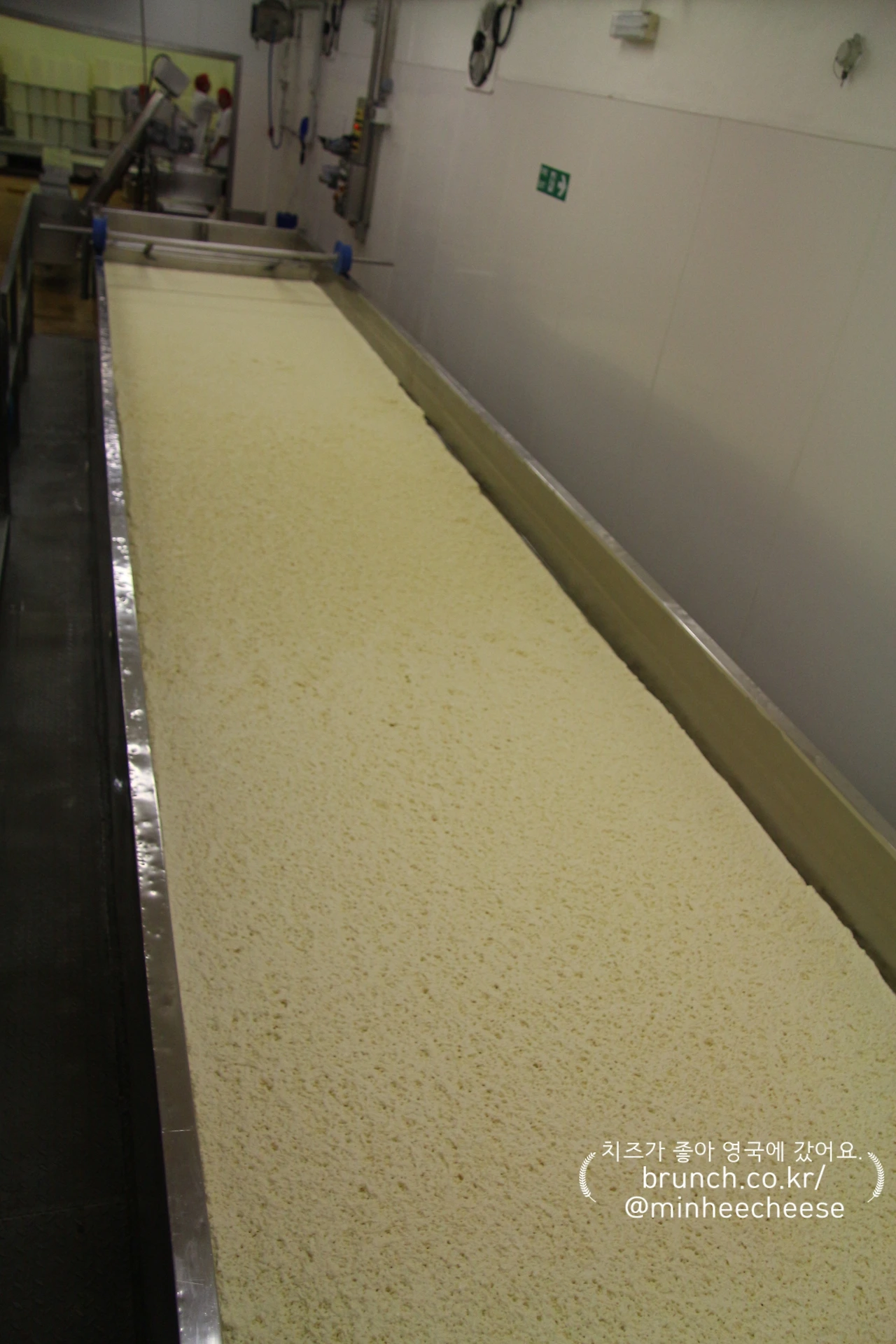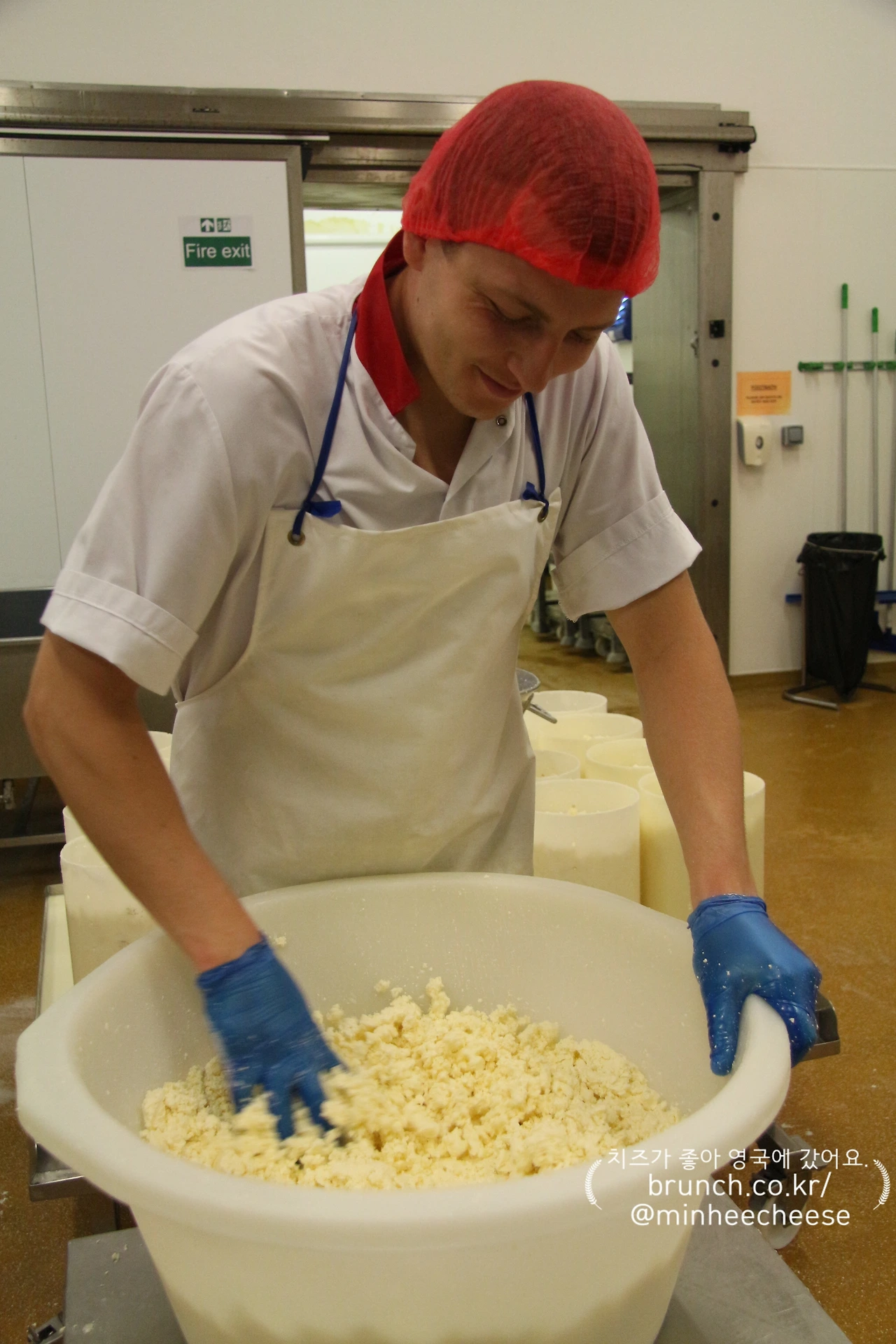 커다란 분쇄기가 작업장에 들어와 배트 옆에 세워졌다. 배트에서 하룻밤을 보낸 커드는 조직이 단단하게 뭉쳐져 사각 블록으로 잘라 들어 올려도 부서지지 않았다. 그렇게 자른 커드 블록을 바로 분쇄기에 밀어 넣었다. 커드를 땅콩만 한 크기로 갈아낸 뒤 한 컵의 소금과 섞은 후 비로소 치즈 틀에 부어 넣는데, 소금은 커드 양의 25%가량을 넣는다. 이날은 1120그램의 분쇄된 커드에 290그램의 소금이 섞였다. 이를 후프 hoop라 불리는 반투명 플라스틱 통에 부어 넣었다. 긴 원통형에 위아래가 뚫려 있는 모양새라 그렇게 부르는 듯했다. 후프에 넣는 커드의 양이 워낙 많아 건장한 남성 작업자들도 끙 소리를 내며 작업을 했다.