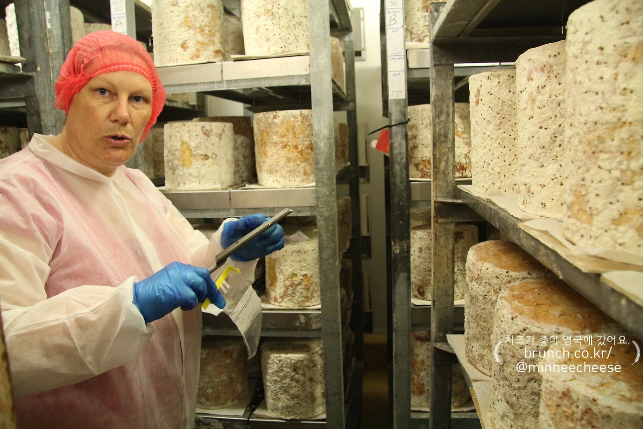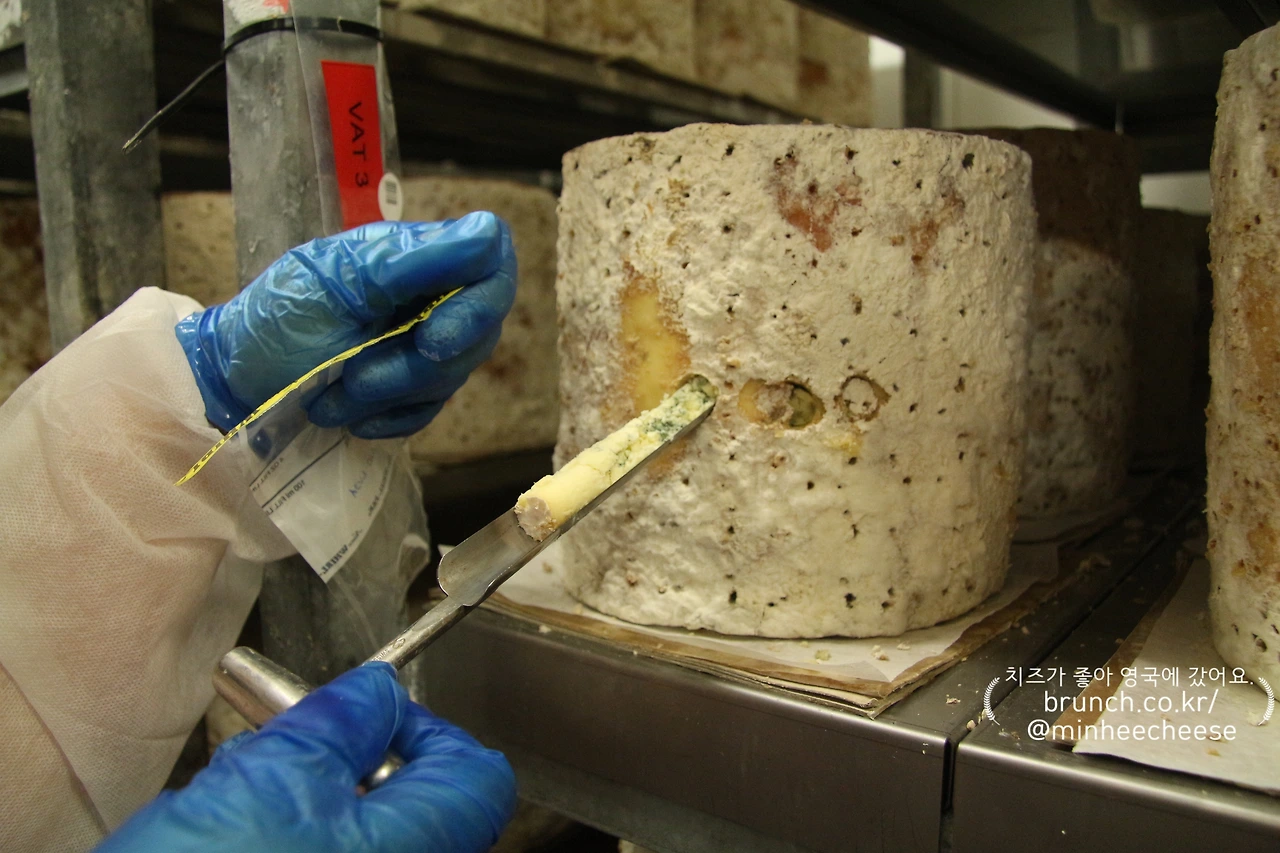 “이 숙성 단계에서는 치즈의 안쪽을 볼 수 없으니 이렇게 빼내서 저 안에서 무슨 일이 일어나고 있는지 검사하는 거예요. 발효 상태나 부패 여부나 질감 등을요.”