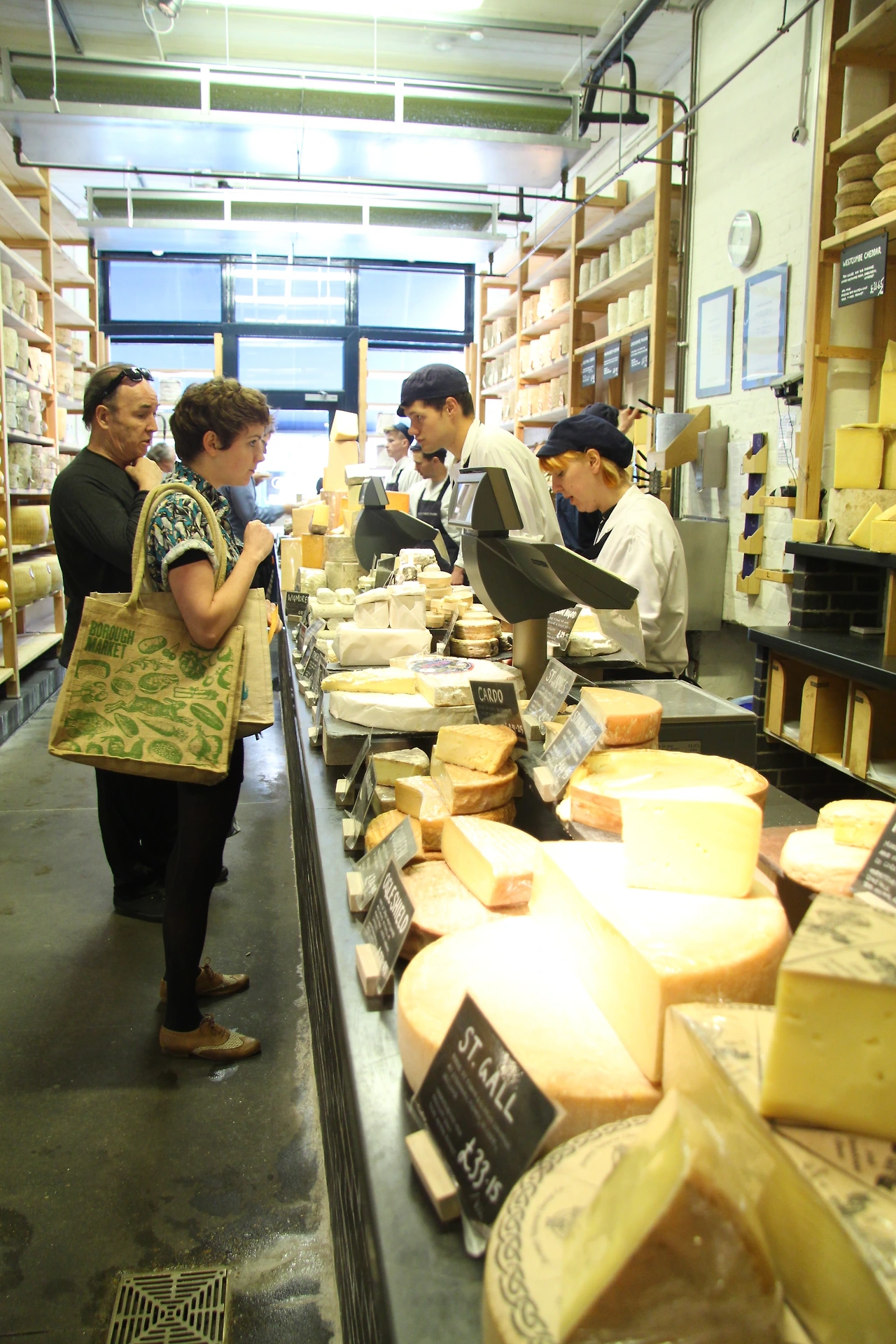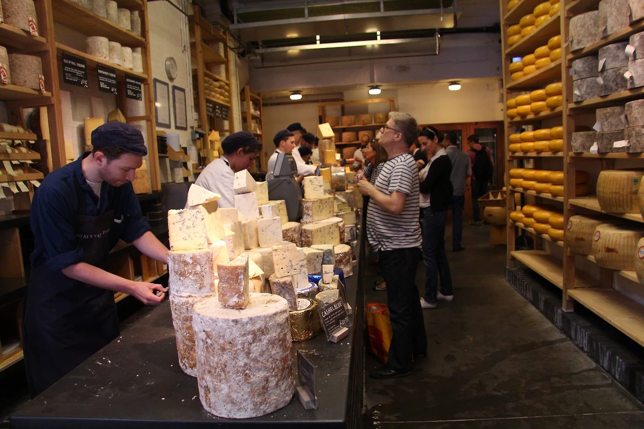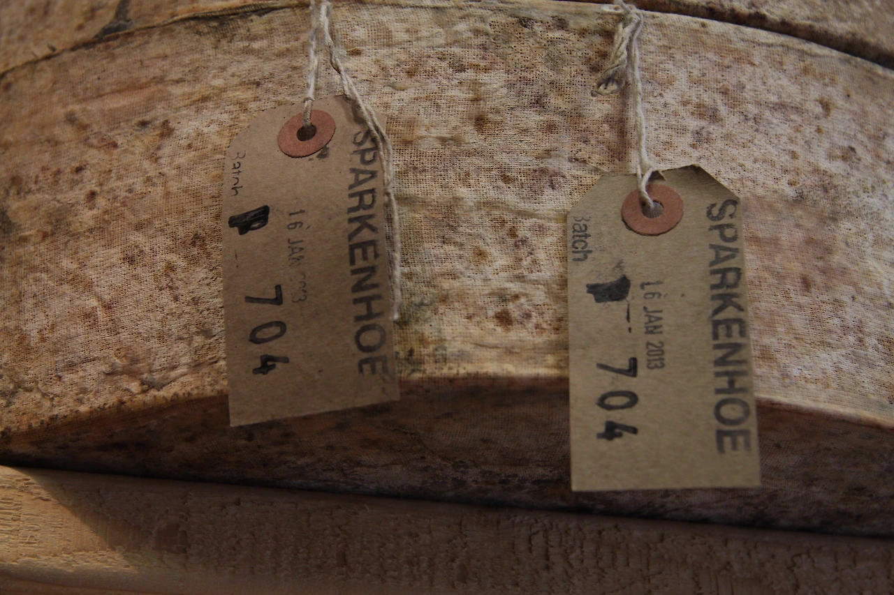 닐스야드 데어리의 치즈 보관실 왼쪽 벽엔 바닥부터 천정까지 나무 선반이 짜여 있어 칸마다 자르지 않은 통치즈가 가득 채워져 있고 오른쪽 벽에는 작고 큰 치즈 수십 종류가 낮은 진열대에 늘어서 있다. 손님이 그중의 치즈를 고르면 직원이 바로 잘라 포장을 해주었다. 이 중 왼쪽에 쌓여 있는 치즈들은 원형 그대로였기에 직접 만져볼 수 있었는데 풀을 먹인 듯 까끌까끌한 모슬린이 치즈 표면에 단단히 붙어 있었다(잘라놓은 치즈는 위생상 만지면 안 되지만 원형 그대로의 치즈는 만져볼 수 있다. 천으로 싸여 있는 외피는 먹는 부분이 아니기 때문이다). 단단한 치즈들은 이렇게 천을 붙여 발효시키는 것이 영국 치즈의 특징이다. 이들 치즈에는 작은 종이로 된 라벨이 달려 있는데 여기에는 치즈 이름, 제조 농장, 치즈를 만든 날짜가 표기되어 있었다.