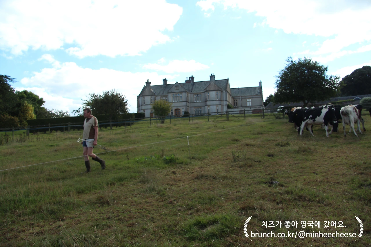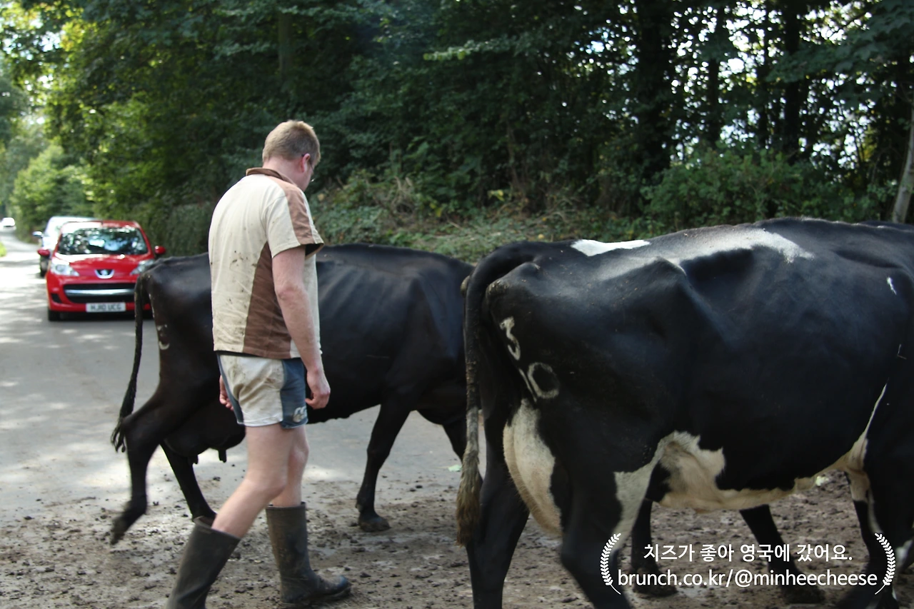 토요일 오전, 농장의 치즈 작업은 쉬는 날이었지만 메리는 주말엔 소들이 풀을 뜯는 모습을 볼 수 있다고 했다. 농장의 사무실에서 만난 해미쉬 Hamish는 뉴질랜드에서 영국 남부의 시골까지 농장의 일을 배우려 왔단다. 그는 흙이 잔뜩 묻은 장화를 신고 세상 편한 미소를 보이며 소가 풀을 뜯으려 이동하는 모습을 보여 줄 수 있다고 했다.