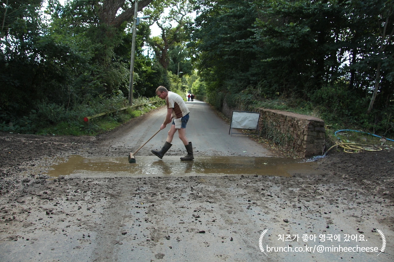 소들이 풀을 다 뜯고 나면 다시 숲길을 따라 길 건너의 축사로 이동을 했고 해미쉬는 아까 사용했던 "소들이 지나갑니다. 천천히 가 주세요." 푯말을 길 가운데 세워 두곤 모두 축사로 들어갈 때까지 한참을 기다렸다. 그렇게 일정이 끝났나 싶었는데 소 들이 두 번이나 지나간 길은 발에 붙어 있던 흙덩이들, 지나가며 뿜어 대는 분비물 등이 뒤엉켜 도로가 진흙 밭처럼 난리였다.