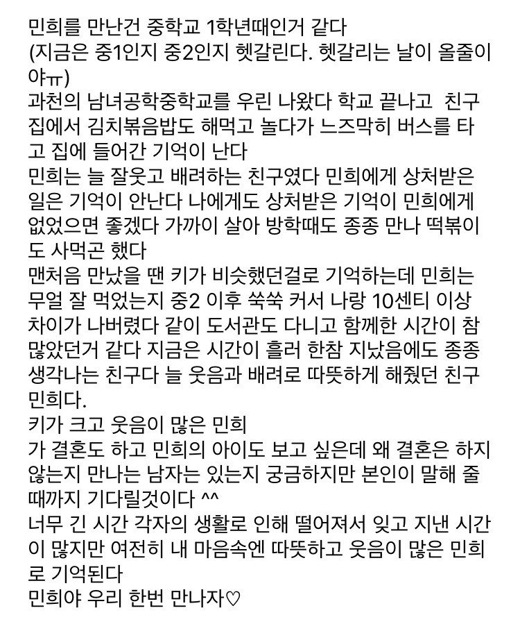 오랜만이야 친구~^^ 최근 내가 참여하는 어떤 모임에서 학창시절 친구에게 글을 받아오는 주제가 생겼는데 누구에게 연락할까하다가 그대가 떠올라 톡을 보내봐. 짧은 글 부탁해도 될까?