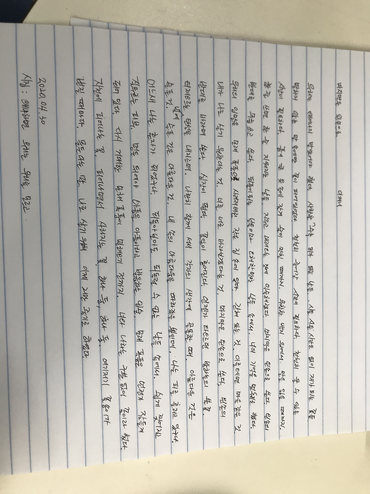 우리는 태어나지 말았어야 했다. 사랑할수록 죄가 되는 날들. 시들 시간도 없이 재가 되는 꽃들. 말하지 않는 말 속에만 꽃이 피어 있었다. 천천히 죽어 갈 시간이 필요하다. 천천히 울 수 있는 사각이 필요하다. 품이 큰 옷 속에 잠겨 숨이 막힐 때까지. 무한한 백지 위에서 말을 잃을 때까지. 한 줄 쓰면 한 줄이 지워지는 날들. 지우고 오려내는 것에 익숙해졌다. 마지막은 왼손으로 쓴다. 왼손의 반대를 무릅쓰고 쓴다. 되풀이되는 날들이라 오해할만한 날들 속에서. 너는 기억을 멈추기로 하였다. 우리의 입말은 모래 폭풍으로 사라져버린 작은 집 속에 있다. 갇혀 있는 것. 이를테면 숨겨온 마음 같은 것. 내가 나로 살기 원한다는 것. 너를 너로 바라보겠다는 것. 마지막은 왼손으로 쓴다. 왼손의 반대를 바라며 쓴다. 심장이 뛴다. 꽃잎이 흩어진다. 언젠가 타오르던 밤하늘의 불꽃. 터져 오르는 빛에 탄성을 내지르며. 나란히 함께 서서 각자의 생각에 골몰할 때. 아름다운 것은 슬픈 것. 슬픈 것은 아름다운 것. 내 속의 아름다움을 따라갔을 뿐인데. 나는 피를 흘리고 있구나. 어느새 나는 혼자가 되었구나. 되돌아보아도 되돌릴 수 없는 날들 속에서. 쉽게 찢어지고 짓무르는 피부. 멍든 뒤에야 아픔을 아픔이라 발음하는 입술. 모래 폭풍은 언젠가 잠들게 되어있다. 다시 거대한 모래 폭풍이 밀려오기 전까지. 너와 나라는 구분 없이 빛을 꽃이라 썼다. 지천에 피어나는 꽃. 피어나면서 사라지는 꽃. 하나 둘. 하나 둘. 여기저기 꽃송이가 번질 때마다. 물든다는 말. 잠든다는 말. 나는 나로 살기 위해 이제 그만 죽기로 하였다.