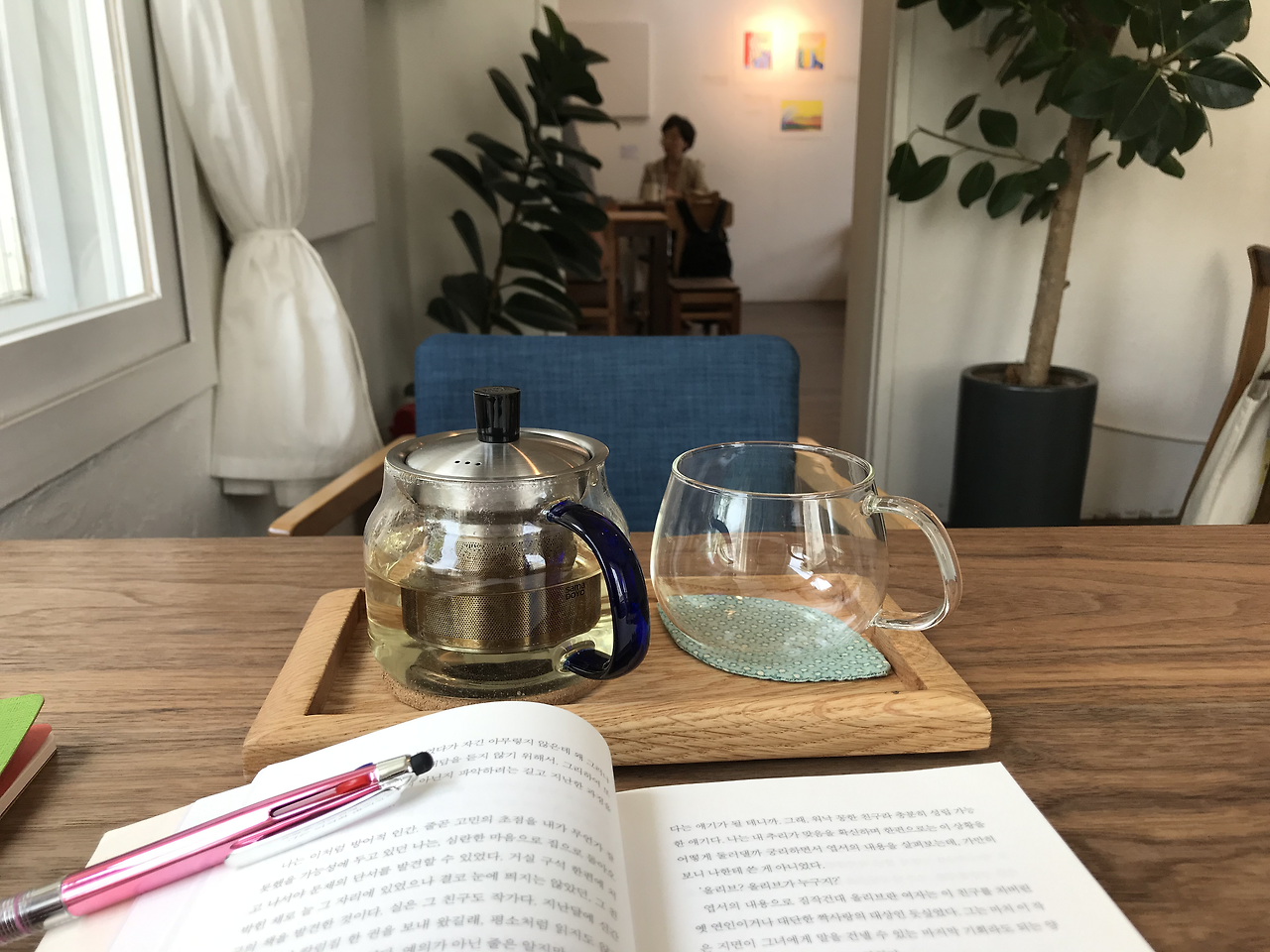 직접 만든 원목 테이블의 느낌이 좋은 곳. 복숭아꽃차를 주문하고 자리에 앉았는데, 앞과 옆 테이블에 출판 편집자들로 추정되는 사람들의 대화가 귀에 꽂힌다.