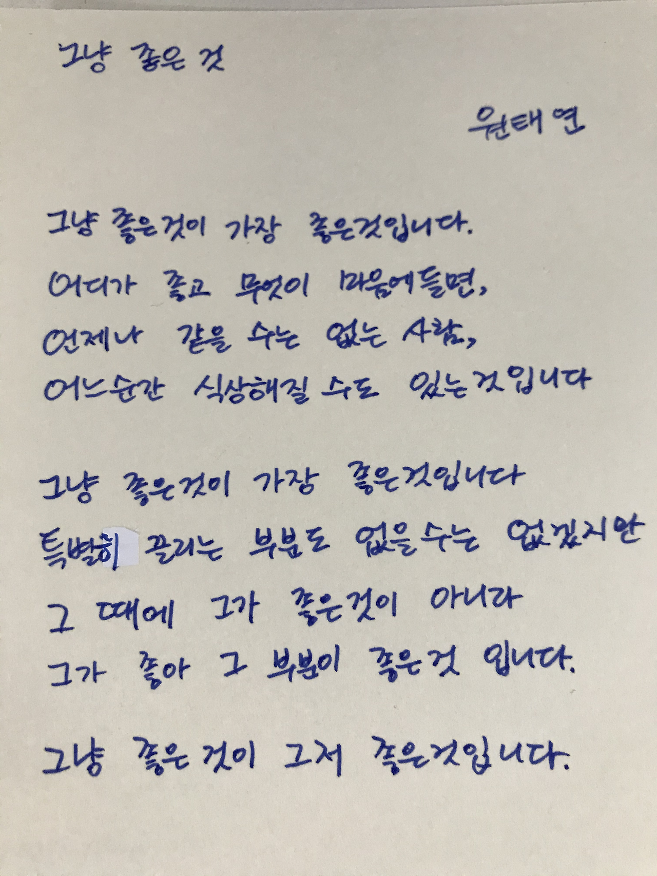 그냥 좋은것이 가장 좋은것입니다.어디가 좋고 무엇이 마음에들면, 언제나 같을수는 없는 사람,어느순간 식상해질수도 있는것입니다 그냥 좋은것이 가장 좋은것입니다.특별히 끌리는 부분도 없을수는 없겠지만 그 때문에 그가 좋은것이 아니라그가 좋아 그 부분이 좋은것 입니다. 그냥 좋은것이 그저 좋은것입니다.