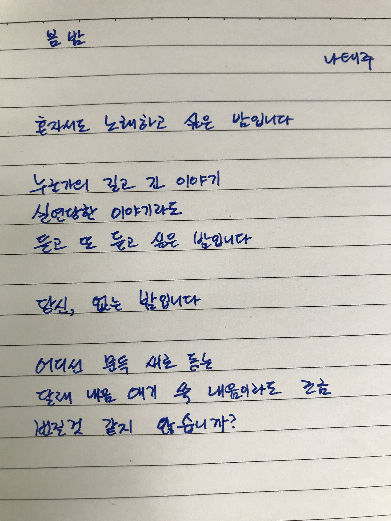 혼자서도 노래하고 싶은 밤입니다 누군가의 길고 긴 이야기실연당한 이야기라도듣고 또 듣고 싶은 밤입니다 당신, 없는 밤입니다 어디선 듯 문득 새로 돋는달래 내음 애기 쑥 내음이라도 조금번질 것 같지 않습니까? 20200517