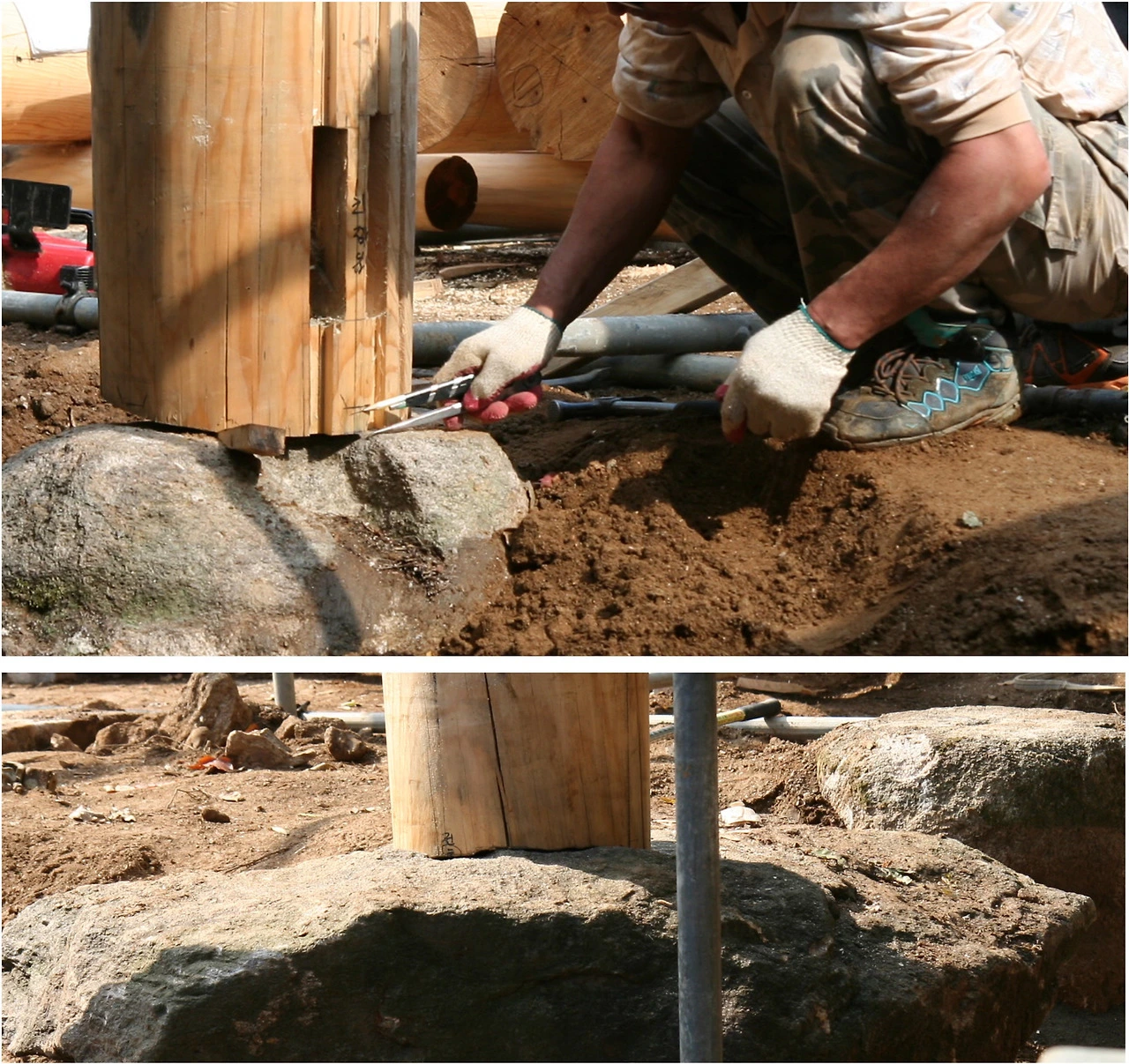 위 사진이 초석을 놓고 기둥을 올려놓은 사진입니다. 저 울퉁불퉁한 초석 위에, 그냥 기둥을 올려놓습니다. 하지만 울퉁불퉁한 돌 위에 기둥을 올려놓으면 당연히 안정적이지 않겠죠. 그래서 안정적으로 기둥을 올려놓기 위해 몇 가지 과정을 거칩니다. 일단 기둥을 수직으로 임시로 고정시키고(다림보기), 초석과 기둥 밑을 일치시키기 위해 초석 모양 그대로 기둥 하부를 그립니다. 그리고 그린만큼 기둥 하부를 제거합니다. 그렇게 되면 초석과 기둥 하부가 밀착되게 됩니다. 그것뿐입니다. 그 외에는 어떠한 접합도 하지 않습니다. 이 과정을 전통건축 기법으로 "그레질"이라고 합니다. 한옥을 짓는데 핵심적인 기술입니다.
