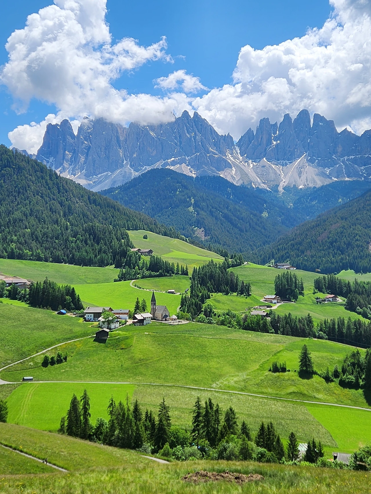 산타 막달레나 교회까지 걸어가서 교회를 한 바퀴 돌아 왼쪽으로 난 길을 따라 걸으면 나타나는 panoramaweg라 쓰인 표지판을 지나 약간 경사진 언덕을 오르니 그 유명한 산타 막달레나 포토 스폿. 교회너머 Geisler 산군이 보이는 풍경은 더없이 평화롭고 아름답다.