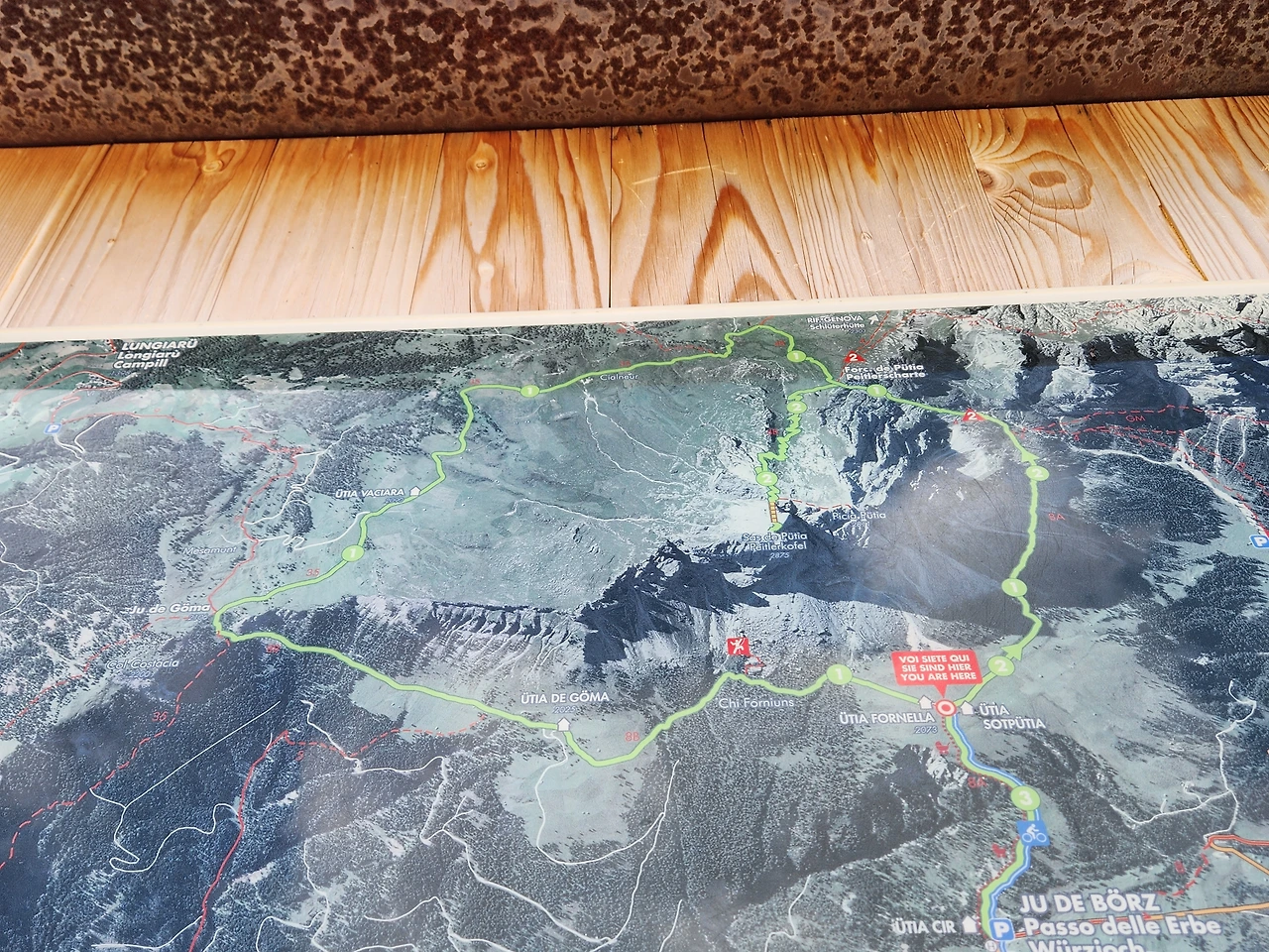 트래킹 경로 : Passo delle Erbe (2006 m) – Forcela de Pütia (2362 m) – Ütia Vaciara (2118 m) – Gömajoch (2100 m) – Ütia de Göma (2030 m) – Munt de Fornella (2067 m) – Passo delle Erbe (2006 m)